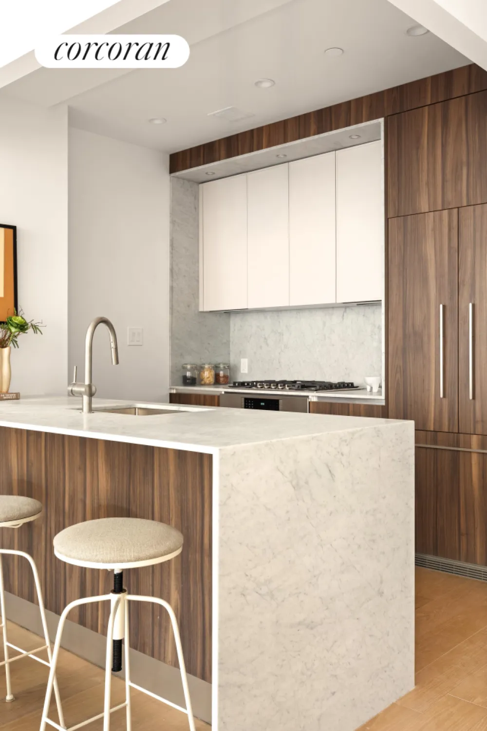 Recognized by a striking bronze-colored brick fa ade that seamlessly celebrates the brownstone vernacular of the surrounding tree-lined and historic streets, all the homes boast gracious layouts and timeless interiors. Extreme attention to every detail separates this jewel from the crowd, and it includes high ceilings, magnificent oak floors, multi-zoned heating and cooling, recessed lighting, and in-unit washers and dryers. Kitchens are outfitted with only the best, including Fisher Paykel, Miele, and Bosch appliances, including gas ranges; honed Carrara marble countertops and surrounds; and custom designed walnut and lacquer cabinetry with generous workspace. Classic Calacatta Gold marble and Travertine bathrooms are reimagined for a spa-like experience and include oversized slab tile, jewel-like brushed nickel hardware, custom-designed medicine cabinets and walnut vanities with great storage, deep soaking tubs, and glass-enclosed walk-in showers.