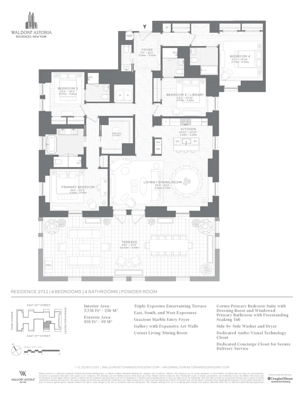 Own a piece of the legacy at Waldorf Astoria Residences New York. Residence 2711 is a one of a kind 2,756 SF four-bed, four-and-a-half-bath, with a 958 SF terrace overlooking the Chrysler Building.