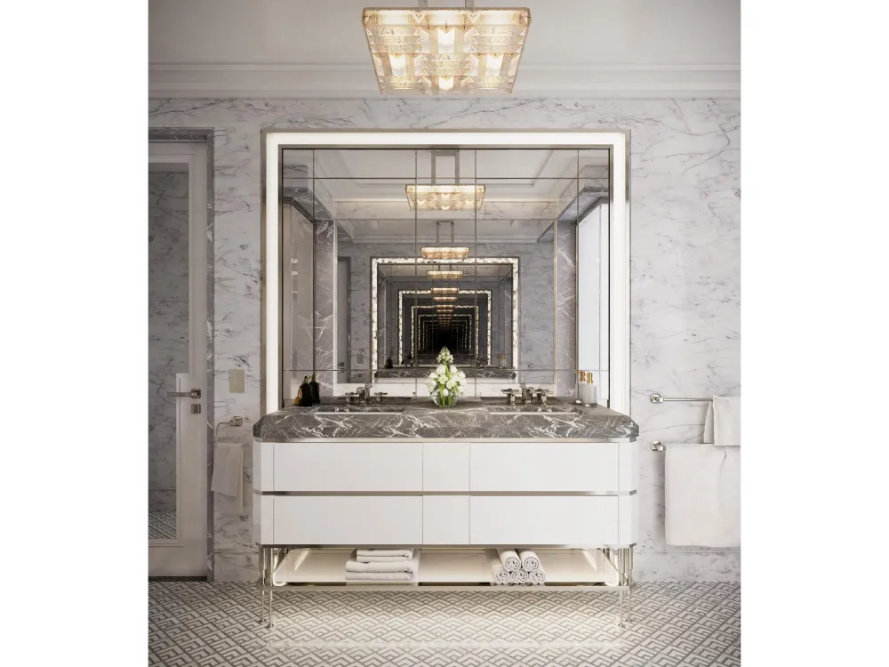 The primary bedroom has a spacious walk-in closet. The windowed five-fixtured bathroom features floor-to-ceiling honed white Bianca Carrara marble slab walls and radiant heated custom designed mosaic marble tile floor. A custom double vanity with polished Luna Gray marble countertop provides exceptional storage complementing the cabinet with integrated lighting, mirror and concealed electric outlet. The freestanding custom designed deep soaking tub offers a thoughtful shelf and sits below a large custom wall mirror featuring fixtures and fittings that are custom forged in polished nickel, exclusively for Waldorf Astoria Residences.