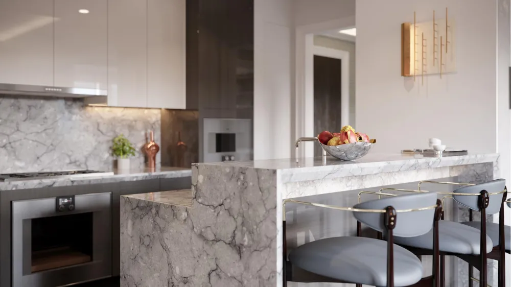 The open kitchen with an island features wood and lacquer cabinetry custom-designed by Deniot and fabricated by Molteni&C, cleverly concealing a top-of-the-line appliance suite by Gaggenau that includes a five- burner gas cooktop with oven and fully vented range hood, separate refrigerator and freezer, wine refrigerator, speed oven and dishwasher, Polished Quartzite Arabescato backsplash and countertops with beveled edges are enhanced by polished nickel fixtures.