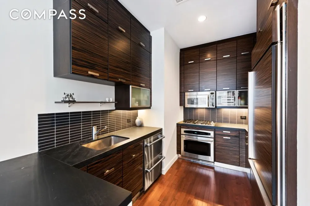 The expansive great room is thoughtfully designed to accommodate both a spacious living area and a full dining setup, complete with an entrance foyer — a rarity among downtown condos. The open-concept chef’s kitchen is outfitted with Macassar Ebony cabinetry, Pietra Cardosa stone countertops, and stainless steel appliances including a Sub-Zero refrigerator, cooktop, microwave, dishwasher, and a wine cooler — perfect for entertaining or everyday living.