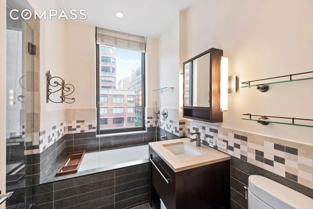 The primary bedroom is a serene retreat, featuring two closets (including a walk-in), floor-to-ceiling windows, and a luxurious en-suite spa bathroom with a deep soaking tub, separate rain shower, and two windows for natural light. The generously sized second bedroom faces south and easily fits a king-sized bed with side tables.