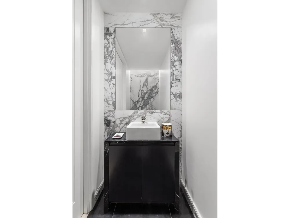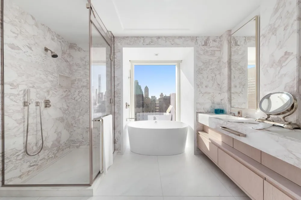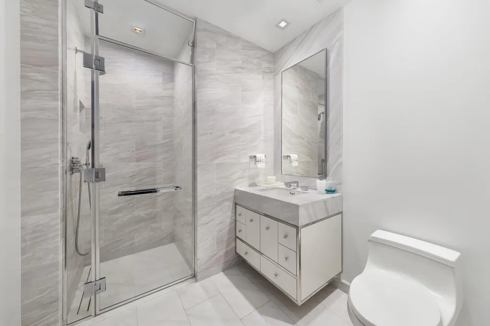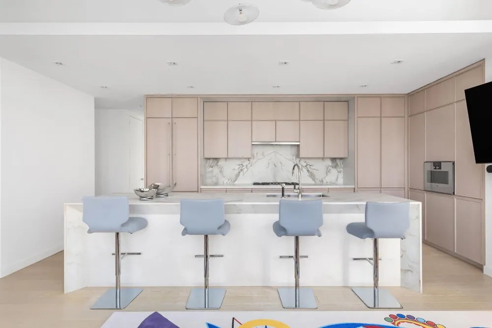 Step into an airy, open-concept living and dining space featuring wide-plank white oak flooring and a custom chef's kitchen with honed Capri marble countertops, matching backsplash, and a waterfall island with seating. Sleek white oak cabinetry conceals a full suite of Gaggenau appliances, including a wine fridge, all accented by Dornbracht fixtures for a clean, refined look. The primary suite is a true retreat with a generous walk-in closet and a spa-caliber five-piece bathroom. Enjoy radiant heated Bianco Dolomiti floors, a glass-enclosed shower, separate Kohler soaking tub, and a custom vanity clad in Marno Illusion marble and rift-cut white oak millwork, topped off with Dornbracht and Kallista fixtures. The powder room makes a dramatic statement with Nero Maquina marble floors and vanity, contrasted with ebony-stained oak and a Cobalt Flash marble wet wall - all complemented by premium fixtures. Additional highlights include a Nest Learning Thermostat and in-unit Bosch washer/dryer.