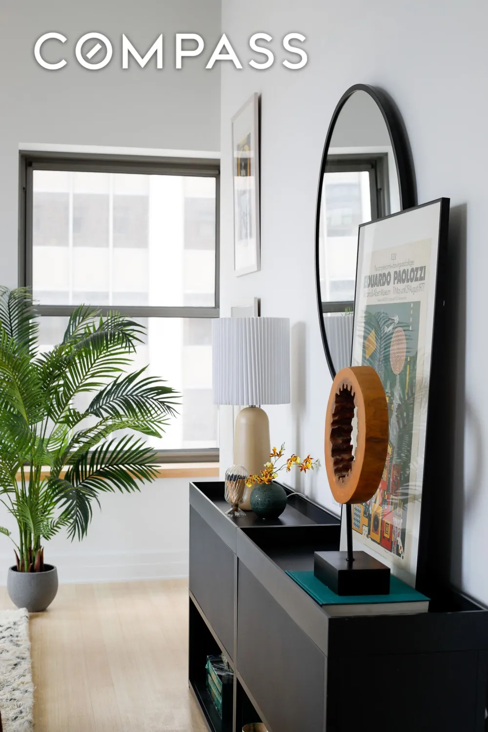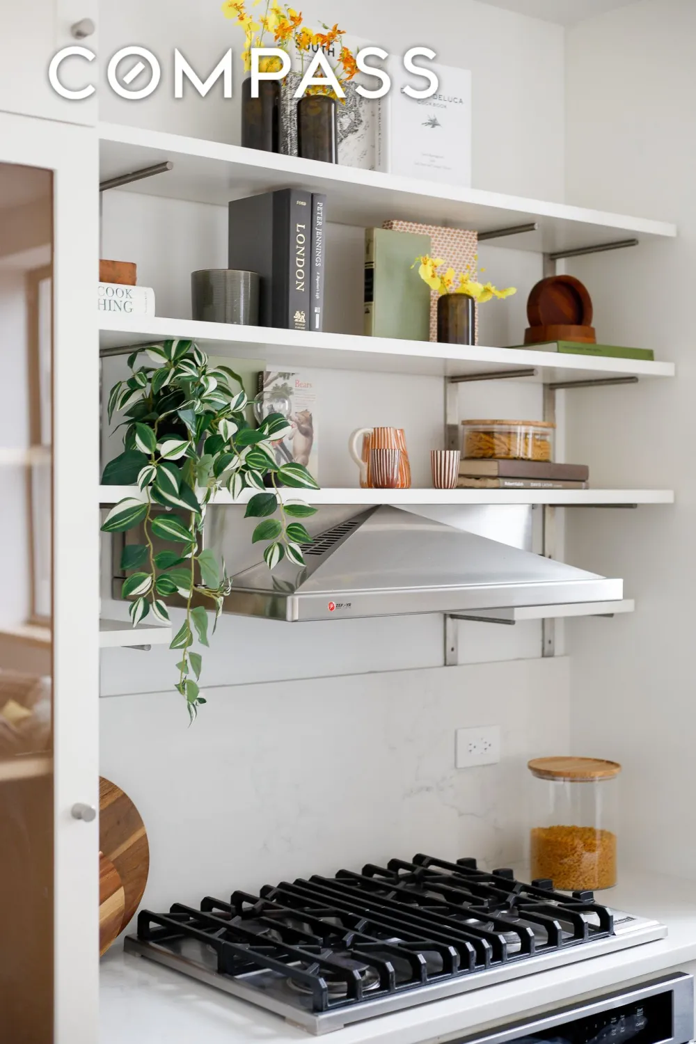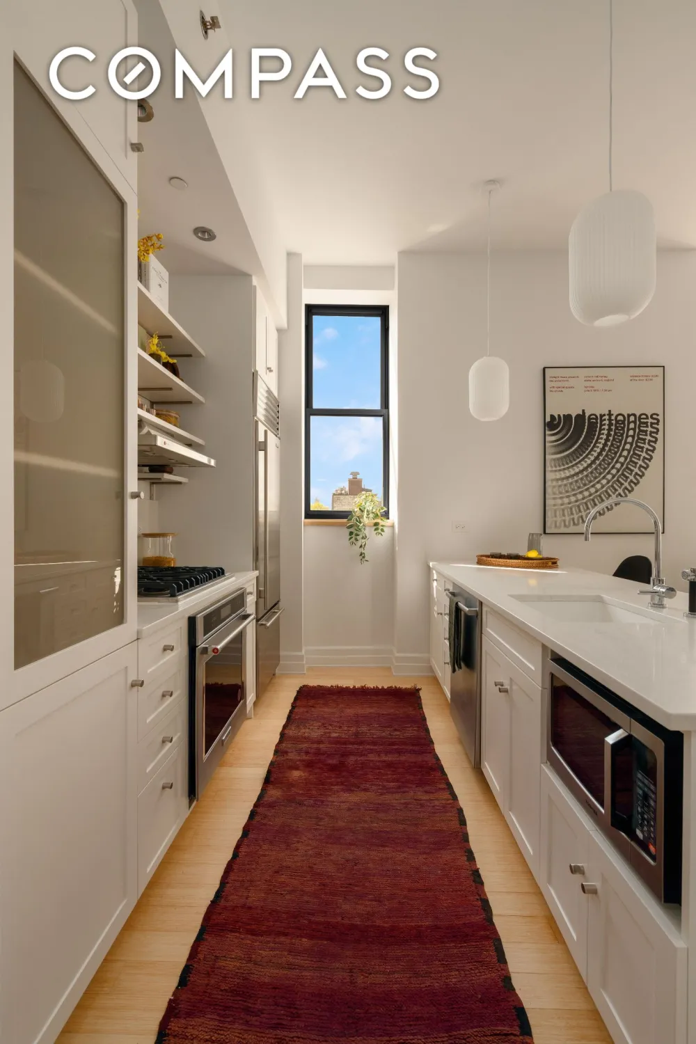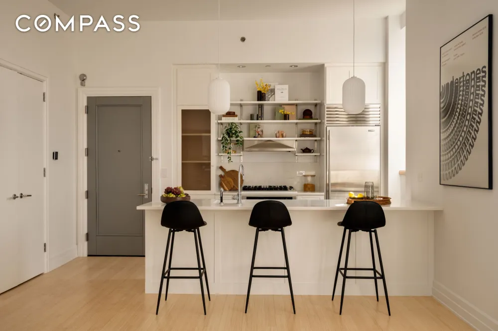 The newly renovated kitchen is a chef's dream, featuring premium appliances, including a Sub-Zero refrigerator, Viking gas range, and Bosch dishwasher. Gorgeous built-ins, a premium stone counter, custom light fixtures and a coveted kitchen window set this home apart from all other one bedrooms in the building. An in-unit washer and dryer in a separate laundry closet provides convenience and extra storage. Central AC and heat are controlled by a smart thermostat for precise year-round climate control.
