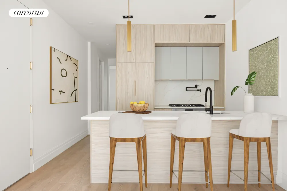 Upon entering the expansive living room, you'll be greeted by a spacious living room with dining alcove, complemented by an original fireplace that exudes timeless elegance. Wide plank oak flooring speak to the natural aesthetic, while the sleek galley kitchen is outfitted with top-of-the-line appliances, including a paneled Fisher & Paykel refrigerator, Bosch five-burner gas stove, built-in drawer microwave, and dishwasher-all seamlessly blended into the kitchen's refined design.