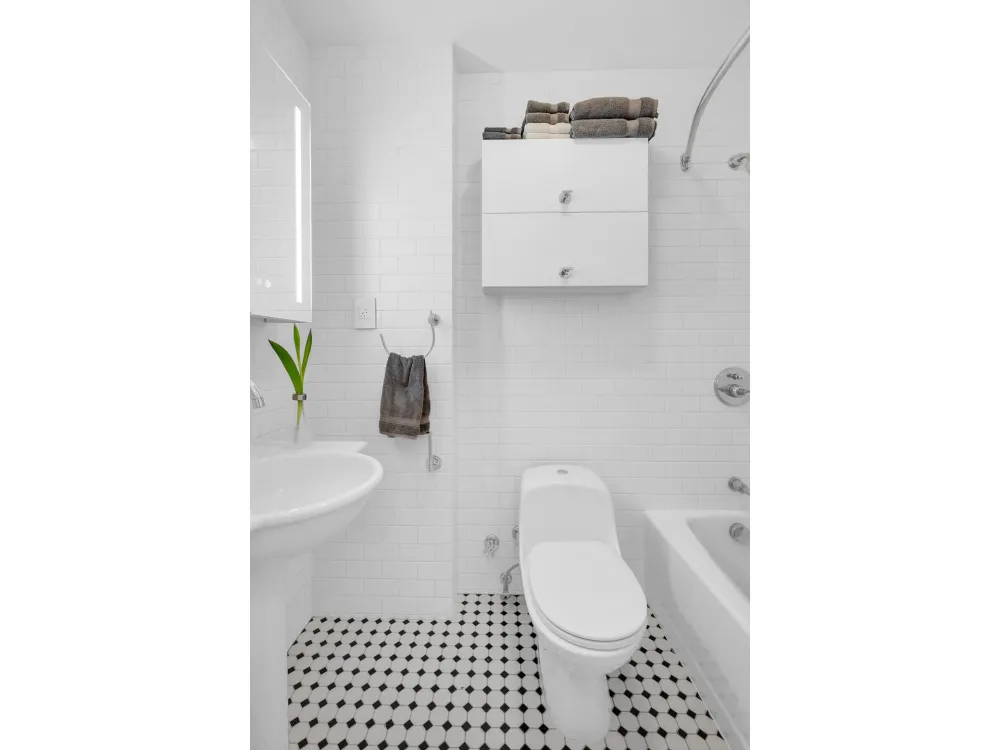 The open kitchen opens up into the living room, allowing for a two-person breakfast bar experience. The current owner has added a floor-to-ceiling customized closet on the western wall of the living room courtesy of TransForm, adding to the many storage options found throughout the home. The wood strip floors throughout the living room are in excellent shape, and the living room window overlooks Madison Avenue towards the west. All electric & lighting boxes have been replaced throughout with Legrand Adorne Smart Outlets & Switches, all covered with Custom Alligator Embossed Thermofoil plates. The outlets include USB in the living room & bedroom. The bathroom features attractive subway tile and polished chrome fixtures, in addition to a Fresca medicine cabinet with LED lighting.