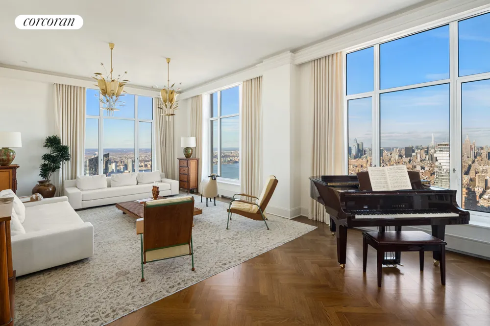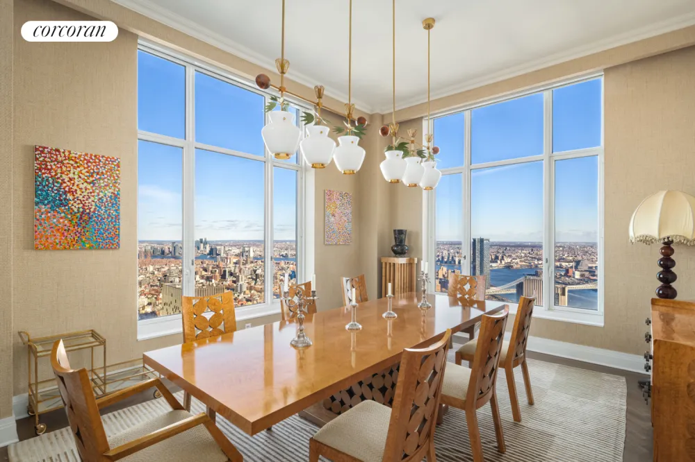 Entrants are greeted by a classical round foyer with immediate and direct views extending across Manhattan. Proceeding further into the home leads to a generously proportioned corner-living and entertaining area adorned with custom window treatments and shelving. An elegant formal dining room is annexed beside the living area with both northern and eastern exposures.