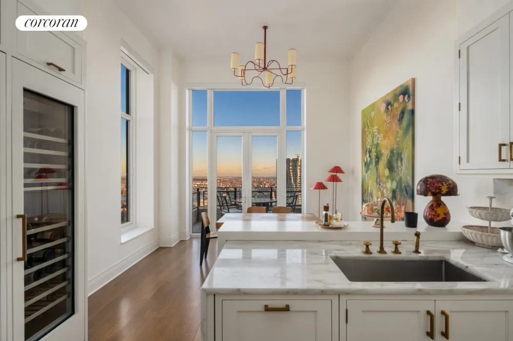 Positioned smartly behind the dining area, the apartment segues into a private butler's pantry and wet bar, followed by a full eat-in kitchen. The kitchen is equipped with custom Bilotta cabinetry, marble counters, and a full suite of Gaggenau appliances (including two full-height wine refrigerators). Its corner position provides ample room for casual dining, as well as an east and north-facing terrace with views of the Woolworth Building and East River.