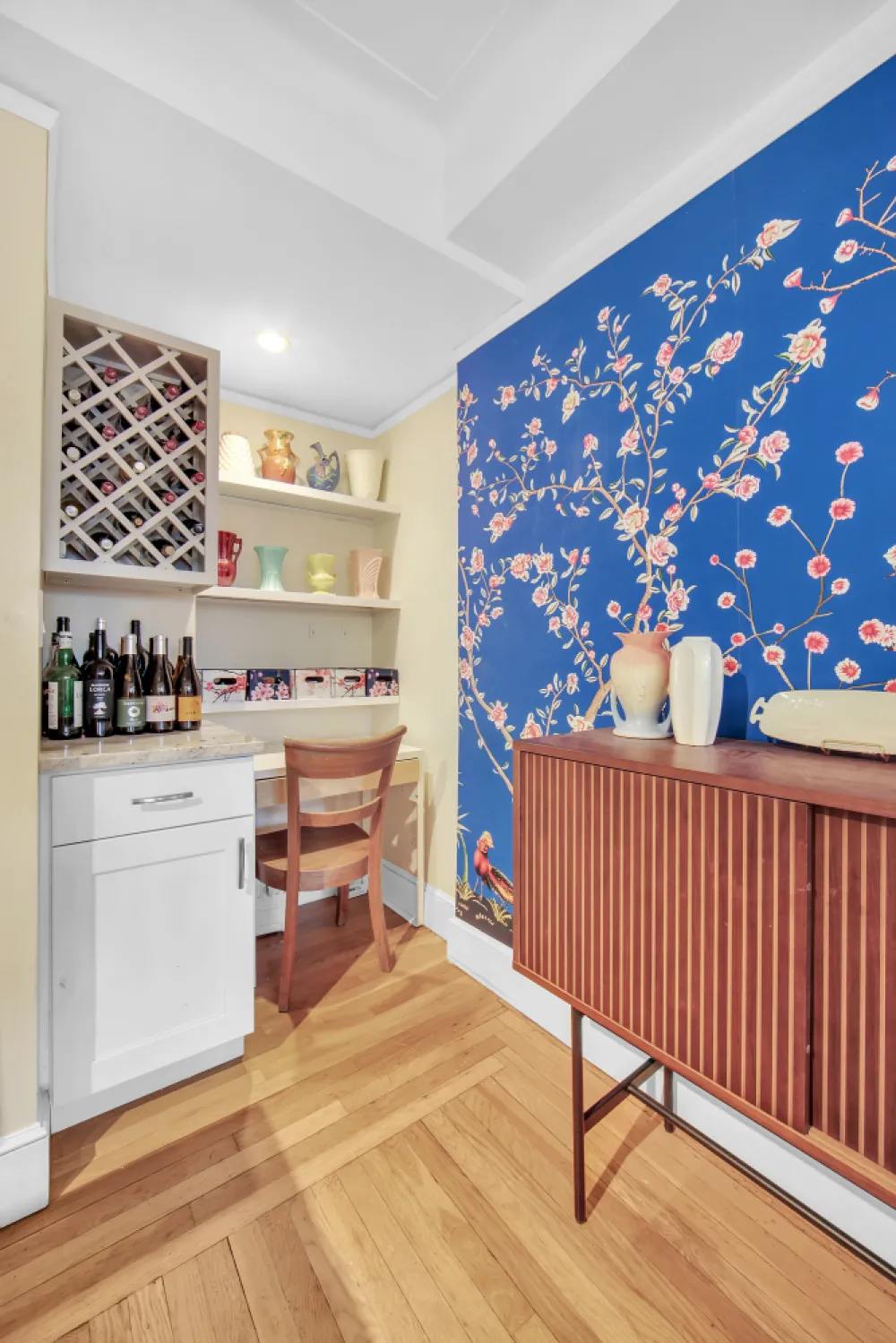 Upon entering 9FG, you are greeted by a large light-filled living and dining room with a renovated open kitchen. The apartment features pre-war charm such as 9 beamed-ceilings, crown molding, and hardwood oak floors. Just off the dining area you'll find a charming nook with a built-in bar and desk.
