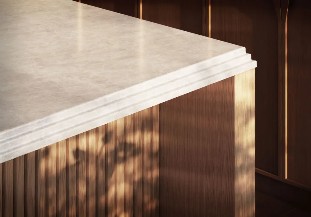Designed with a focus on simplicity as a way of life, with interiors designed by AD100 Workstead that layer elegance and function that feel intimate in scale and have a soft calming effect. The oversized kitchen presents custom white oak cabinetry adorned with custom white oak hardware that is beautifully paired with a striking honed Taj Mahal quartzite countertop, backsplash and ledge. The integrated state-of-the-art Masterpiece Series Thermador appliance suite blends seamlessly into the background, while the custom light pendant designed by Workstead and paneled under-counter integrated XO wine cooler call attention to many the thoughtful design details.