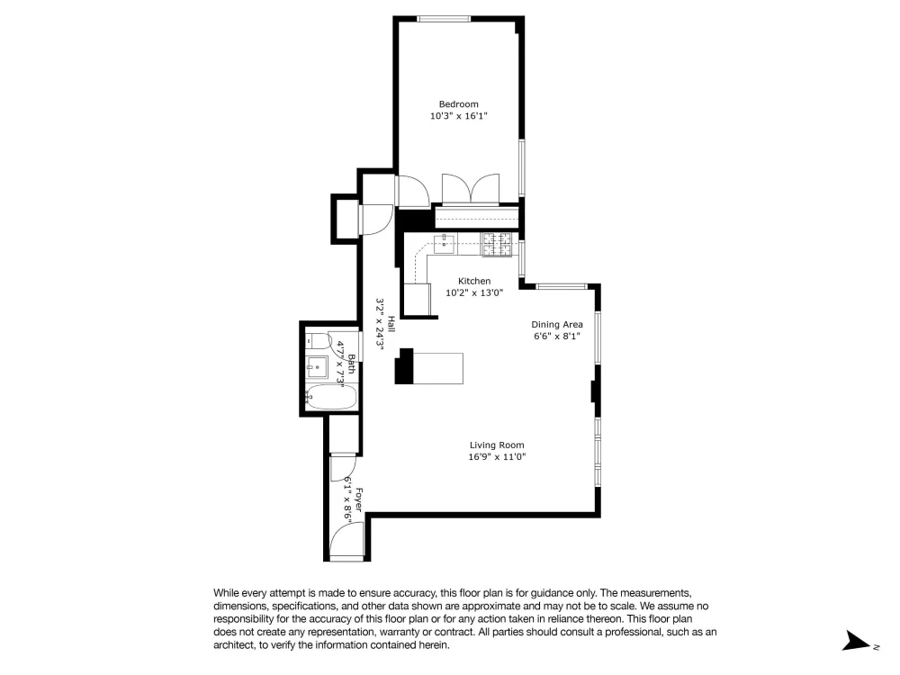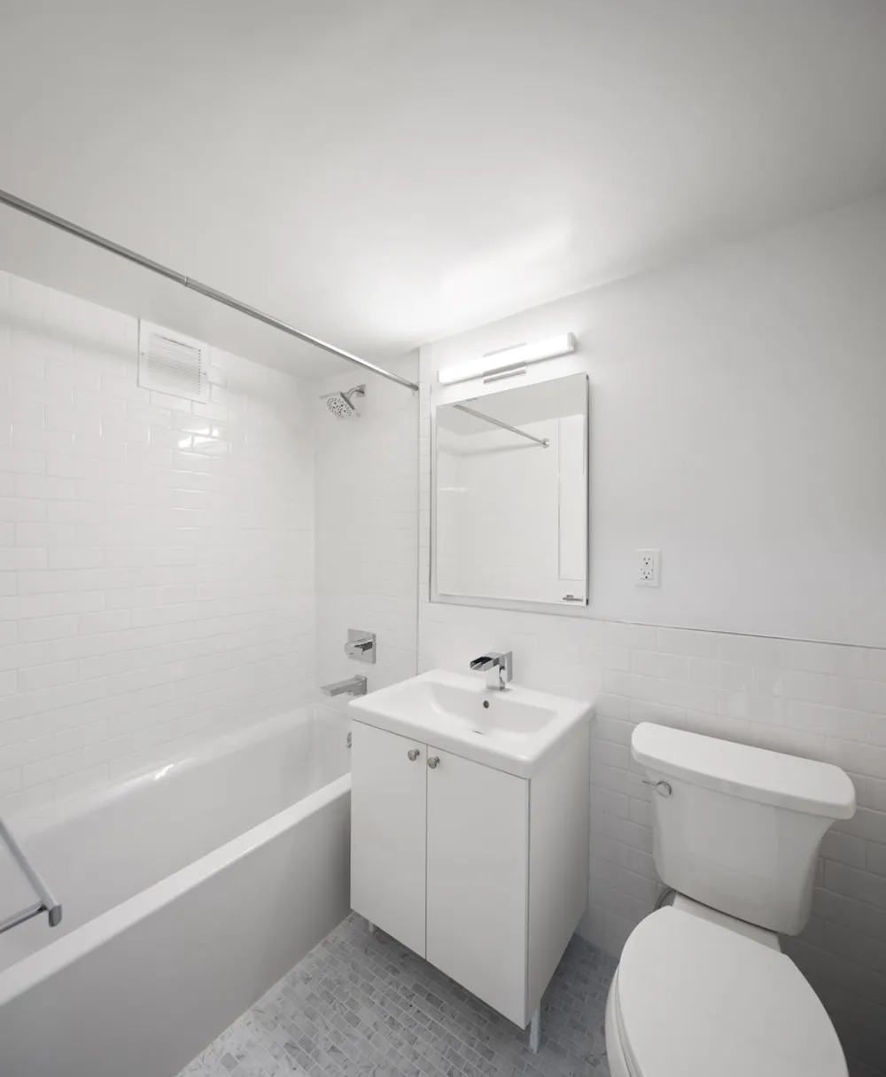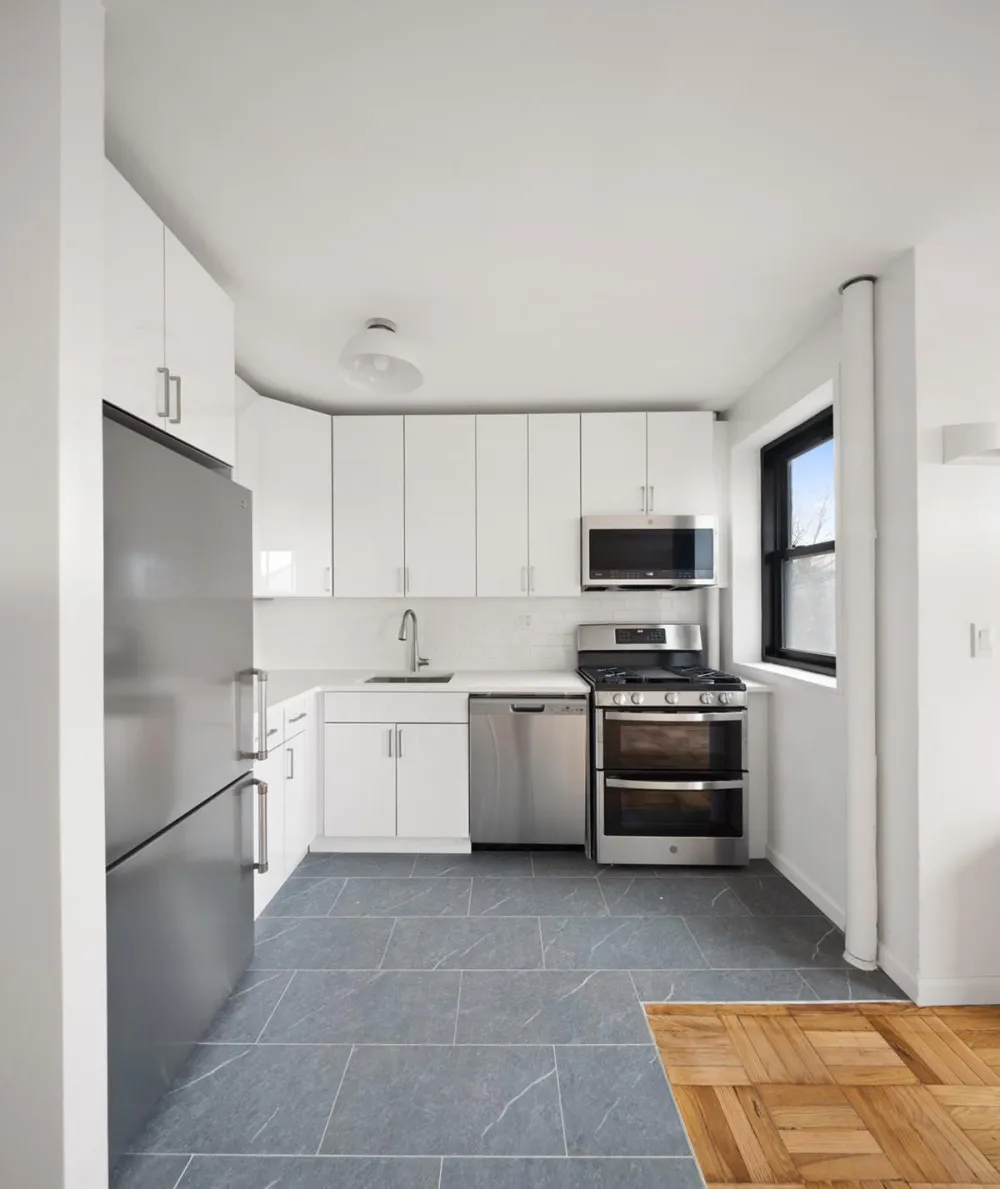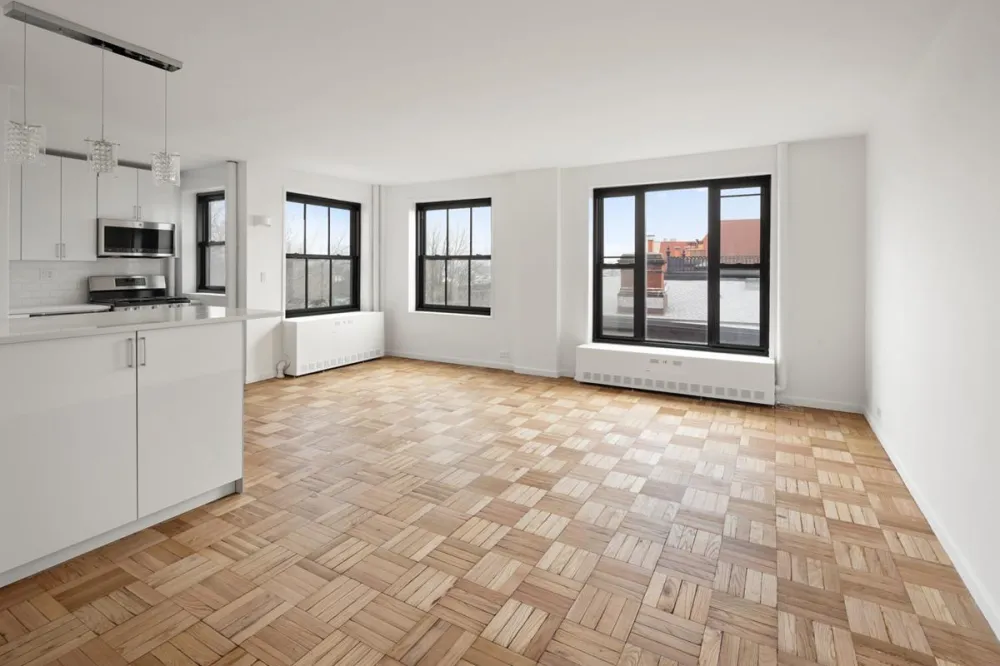 Beautifully renovated 1 bedroom home in the heart of Clinton Hill, Brooklyn. With sweeping views from two exposures, this 7th floor apartment is bathed in light throughout the day. The apartment has a fully open layout. As you enter you can feel the flow of the nicely sized living and dining room that are open to the fully renovated windowed kitchen. The Kitchen features a breakfast bar and new white cabinetry, pendent lighting, and new SS appliances. The corner primary bedroom is nicely separated from the living and dining space and features two windows. This spacious bedroom will easily accommodate a king-sized bed and boasts a large floor to ceiling closet. The full bathroom is modern in style, featuring patterned ceramic floor tiles and white subway wall tile. This apartment boasts recently refinished original flooring, and abundant closet space throughout.