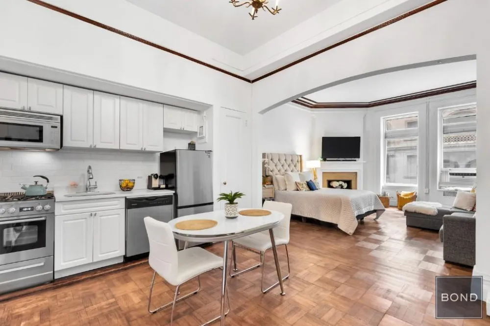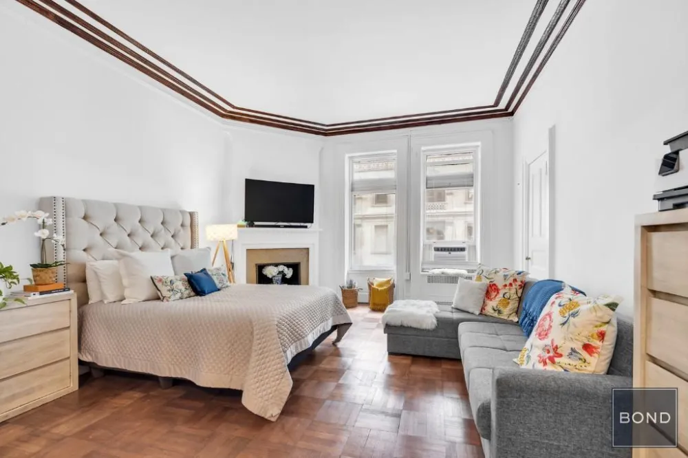 Apartment 5B is a south-facing extra large studio with soaring 12-ft ceilings with gorgeous molding, hardwood floors and a decorative fireplace. The large newly-renovated eat-in kitchen and spacious living area can accommodate plenty of guests.