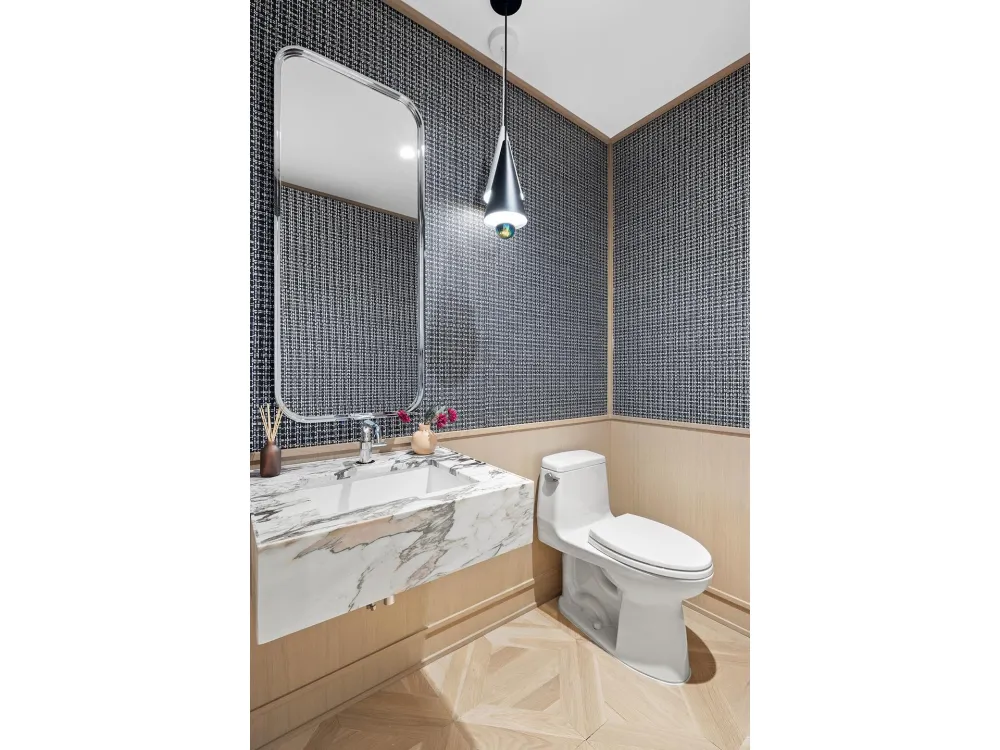 The light-filled master suite features an exquisite master bathroom styled with a custom Paris Forino-designed White Oak vanity with integrated double-sinks with fixtures in polished chrome. Honed marble countertops, Calacatta Eve walls, custom Bianco Real mosaic floors, and polished chrome rain showerhead with thermostatic control attribute to the exceptional comfort and relaxation. The secondary bathroom offers custom White Oak vanity and honed Bianco Carrara countertops, walls, and floors, surrounding a bathtub with polished chrome fixtures. The powder room features custom marble sink and polished chrome fixtures with a Toto toilet.