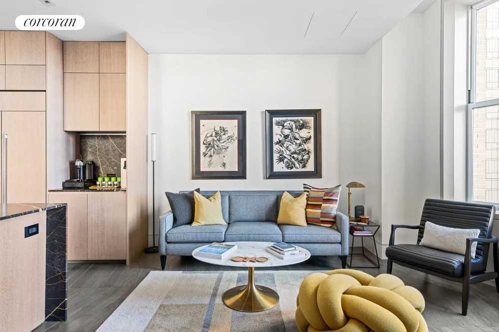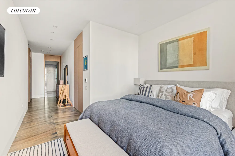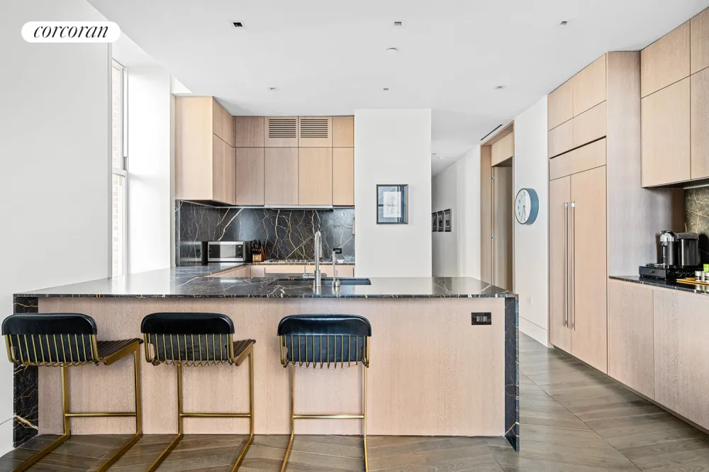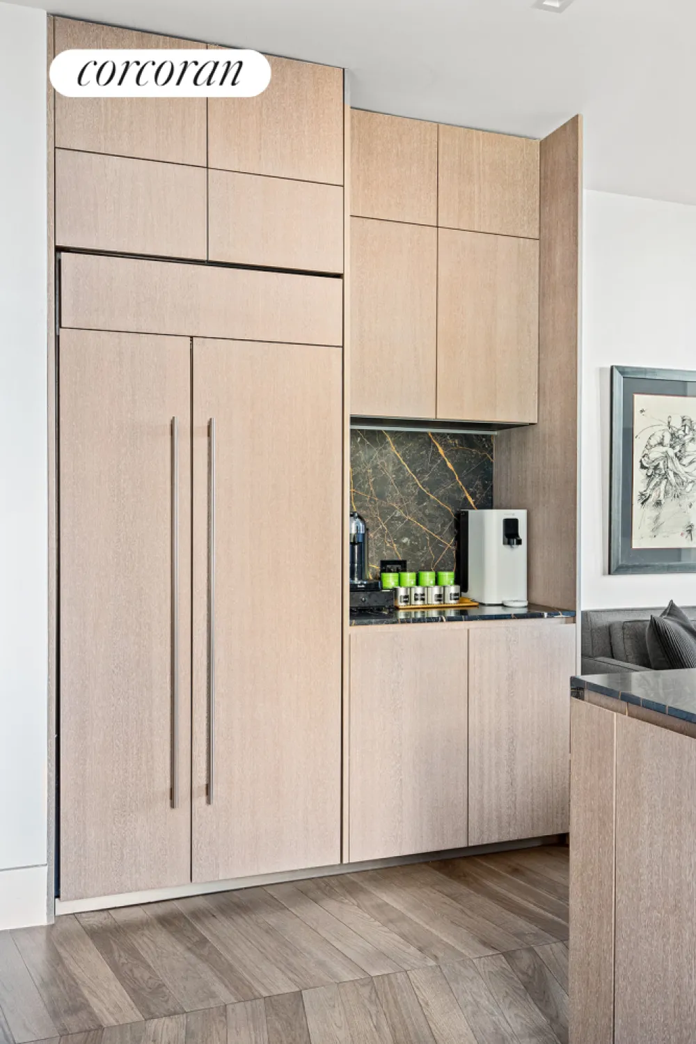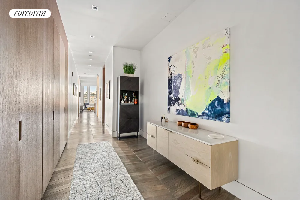 Designed by the esteemed Gabellini Sheppard, renowned for their luxe minimalism, this home welcomes you with an oversized entry into a spacious foyer fitted with custom closets-a distinctive feature in New York City living. The meticulous craftsmanship, including hickory hardwood floors laid in an elegant chevron pattern throughout, underscores the residence's meticulous attention to detail.