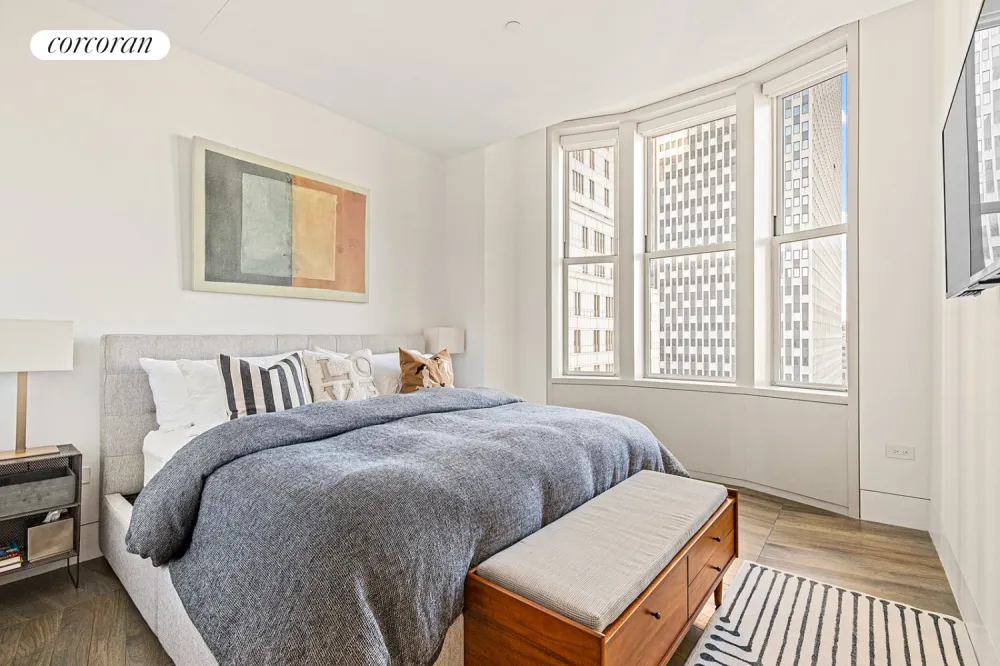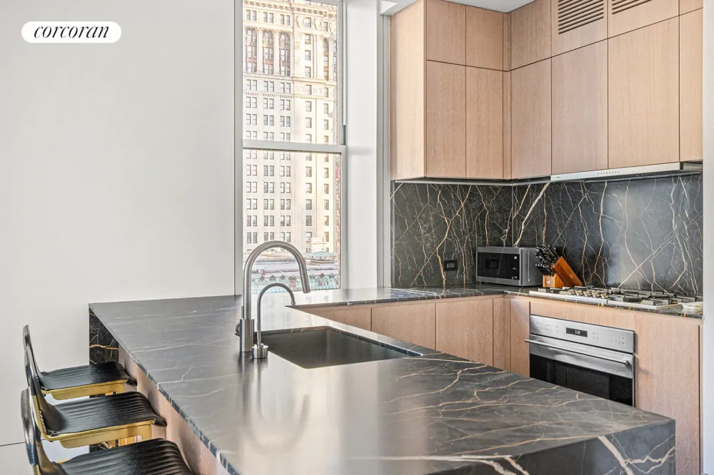 Adjacent to the primary suite, the sunlit second bedroom features three oversized windows with a view of the historic Manhattan Municipal Building. The palatial secondary bath has Honed Casona Pietra Forte Forentina Sandstone tiles, a custom Apaiser stone vanity, and brushed Nickel Waterworks fixtures. Completing the ensemble of upscale living, the apartment hosts a full-size washer and dryer for your convenience and comfort.