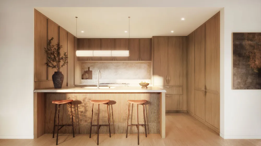 The bathrooms at Bergen are outfitted with soft tones and warm wood accents that make for a spa-like oasis with materials that are crafted to last. The four-piece primary suite is adorned with honed Crema Vanilla marble wall and floor tiles, a custom white oak vanity with Crema Vanilla marble countertop, legs and ledge, and a separate glass enclosed shower. Finishing touches include radiant heated floors and custom light fixtures by Workstead. The secondary bathroom is functional and formal and features a custom white oak vanity topped with a honed Agglo terrazzo countertop, matte Tatami-Beige wall tiles and honed Agglo terrazzo floor tiles. Custom designed light fixtures by Workstead complete these jewel boxes.
