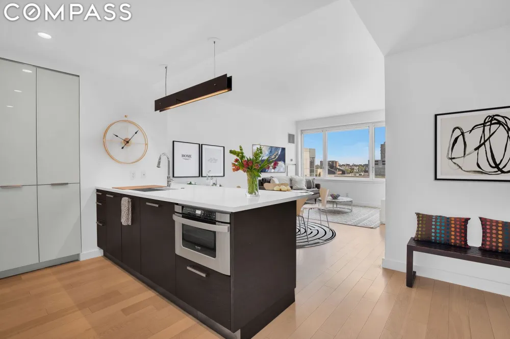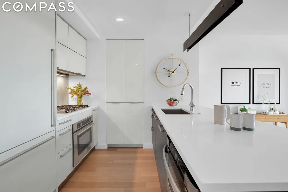 This incredible apartment fully captures a modern luxury lifestyle, featuring a spacious layout with a stunning gourmet chef's kitchen, oversized windows, and great closet space. The open-kitchen boasts ample premium counters, a breakfast bar, as well as top-of-the-line Miele and Bosch appliances, including a microwave, and a dishwasher for modern convenience.