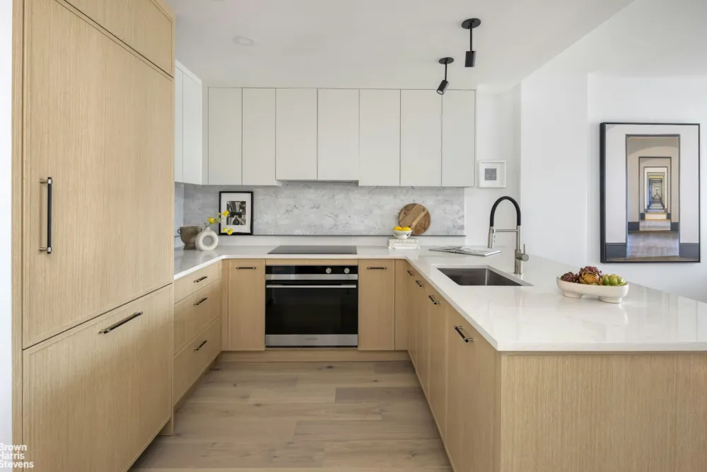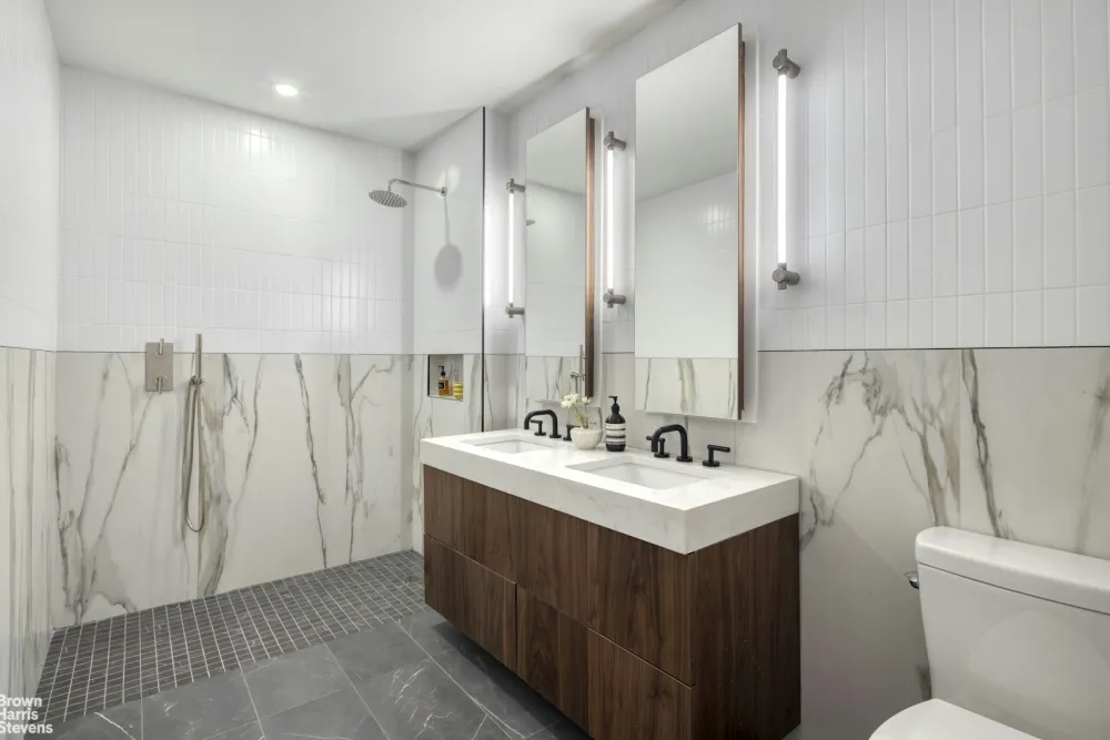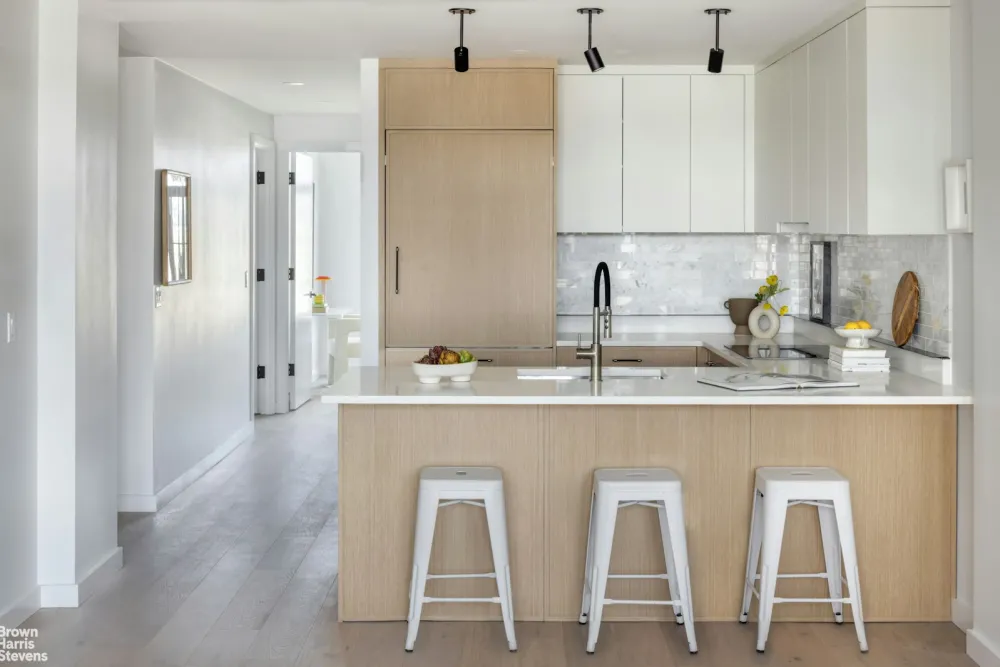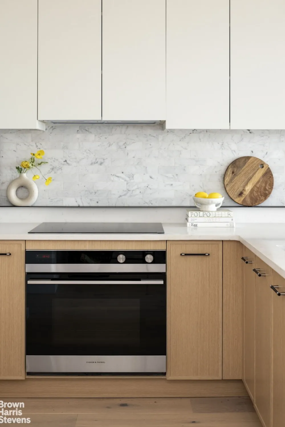 The warm and inviting kitchens feature custom cabinetry, premium Fisher & Paykel appliances, and sleek Carrara quartz countertops. Perfectly crafted for everything from chef-inspired home cooking to serving up the best local takeout in style. Bathrooms are designed as mini retreats in a palette of light and serene porcelain Calacatta tile, Carrara quartz, and walnut wood veneer. Custom wall-hung vanities create a clean minimalist look while full-height wall treatments add a thoughtful touch of sophistication.