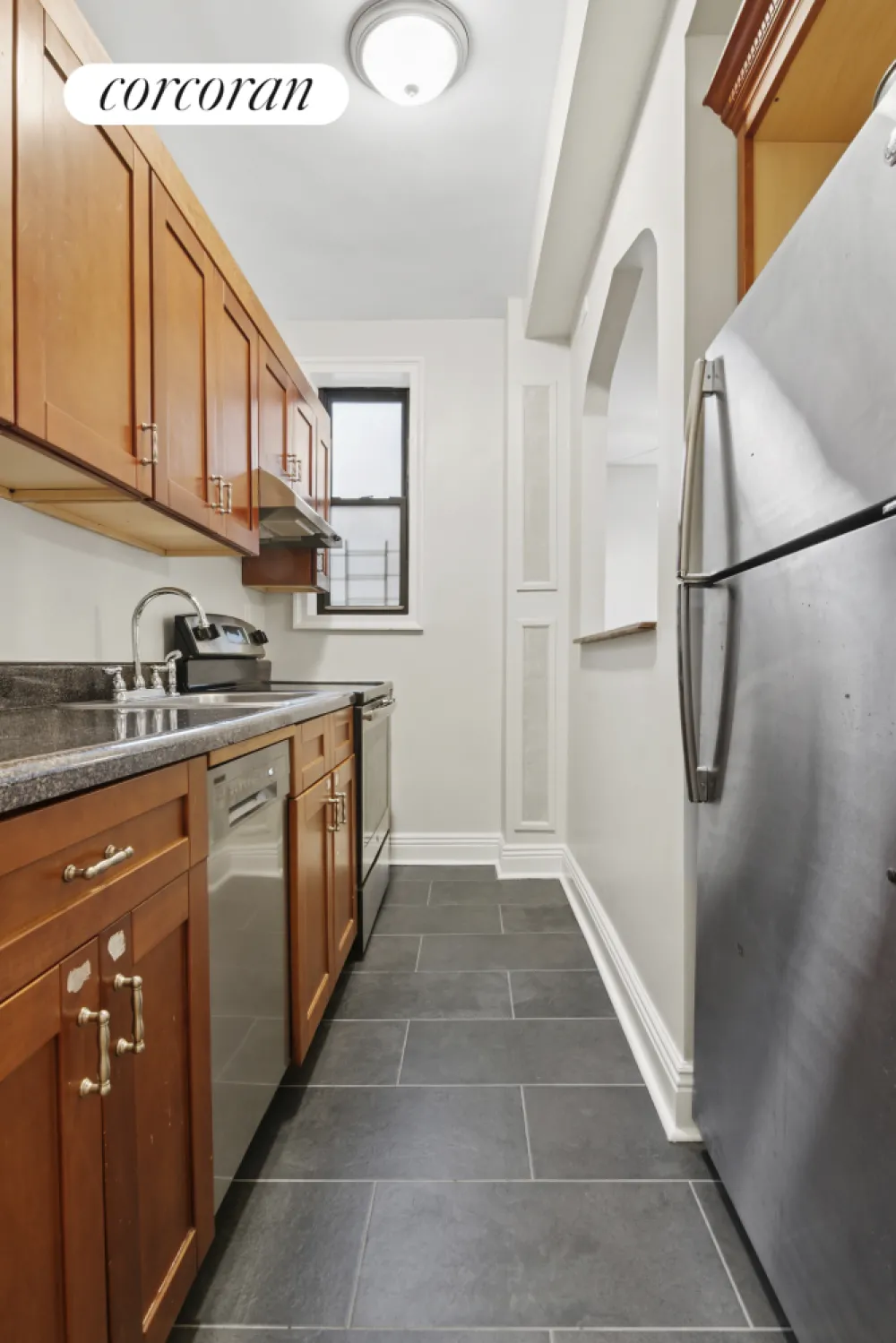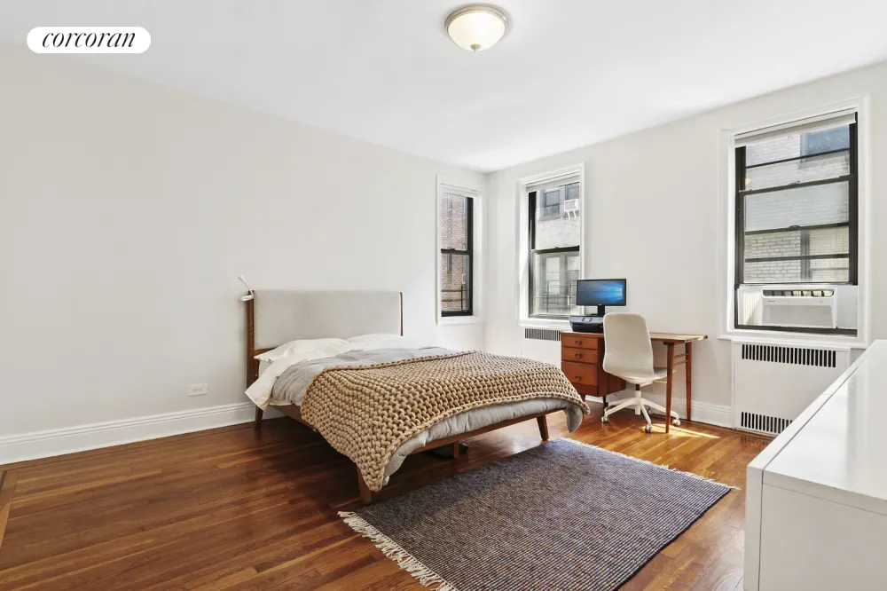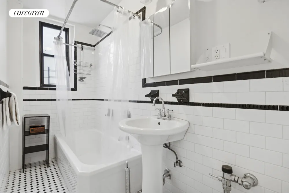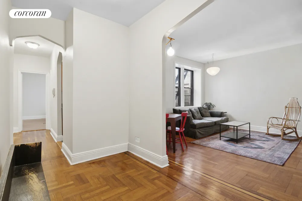 The recently renovated Art Deco lobby of 45 Martense Street welcomes you to the new elevator up to the fifth floor of the co-op where 45 Martense Street #5L unfolds in all its Art Deco splendor: a welcoming foyer outfitted with a huge coat/utility closet leads to an Art Deco arabesque arch opening onto the heart of the home, the wide living room with double windows allowing southeast light. The owners have outfitted this room with a clerestory windowed wall to create a second bedroom. Another arch creates a pass-through to the kitchen, designed for efficiency and entertaining. This windowed kitchen is outfitted with stainless steel full-size appliances (electric stove, fridge, dishwasher, microwave) porcelain tile floor and backsplash, generous countertops and cabinets. The hallway leads to the separate residential area: The spa-like windowed bathroom has authentic Art Deco finishes including a luxurious cast iron bathtub big enough for two, mirrored medicine cabinet and flattering lighting. The double-windowed bedroom fits a king-size bed, two side tables and sitting area and has two huge fully outfitted closets.