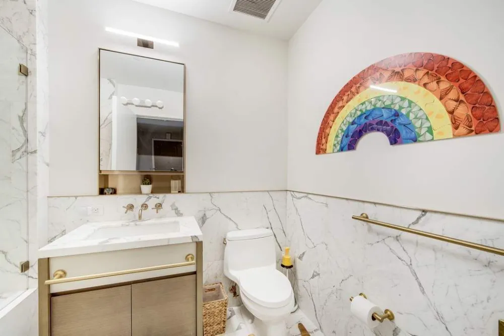 The custom Poliform kitchen is outfitted with sleek lacquered cabinetry, under-cabinet lighting, soft-close drawers, and top-of-the-line Miele appliances. Elegant Calacatta marble countertops and backsplash add timeless sophistication to this modern culinary space. The statuary white marble bathroom features brushed bronze fittings, a custom bleached walnut vanity, and a deep soaking tub with shower—perfect for unwinding at the end of the day.