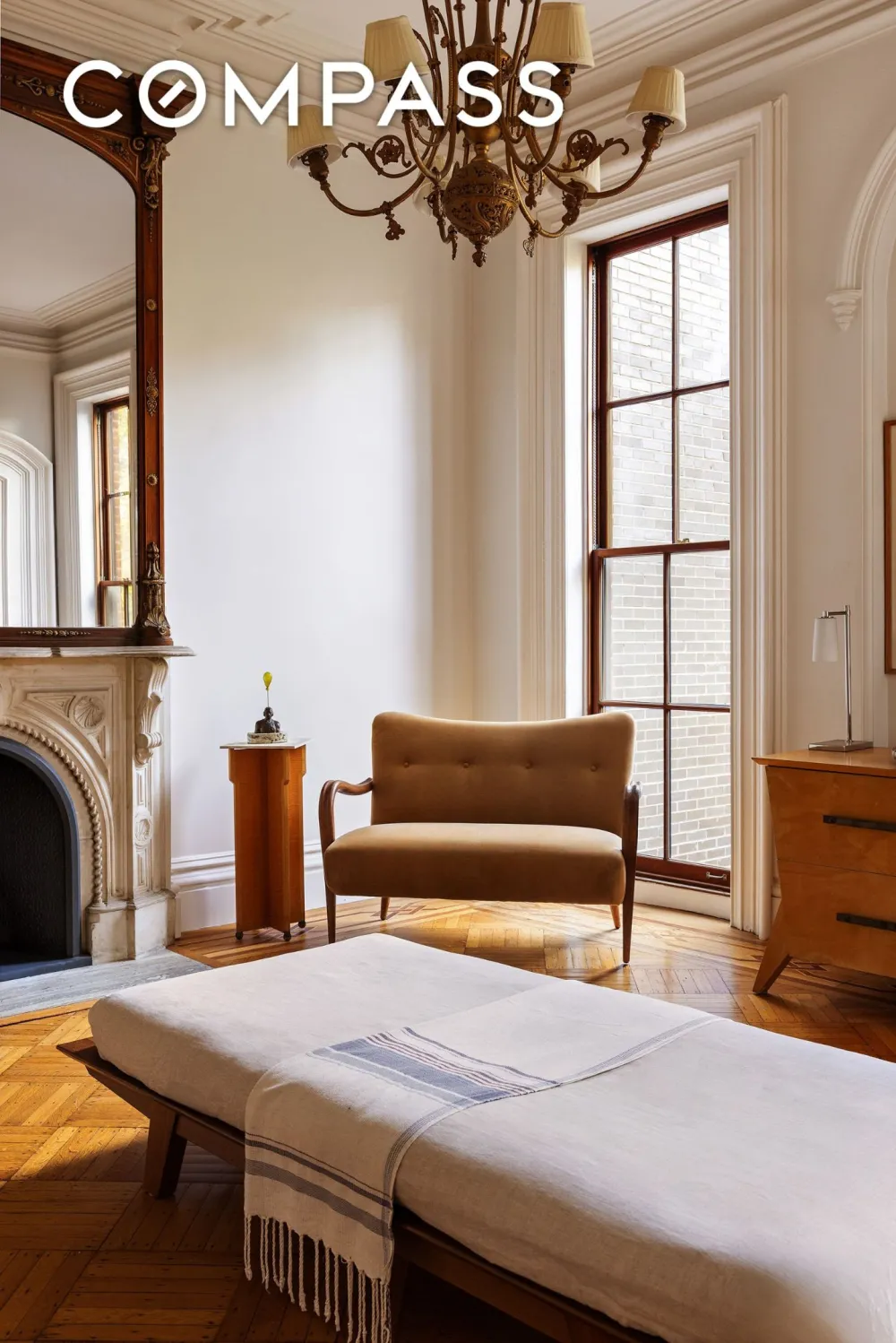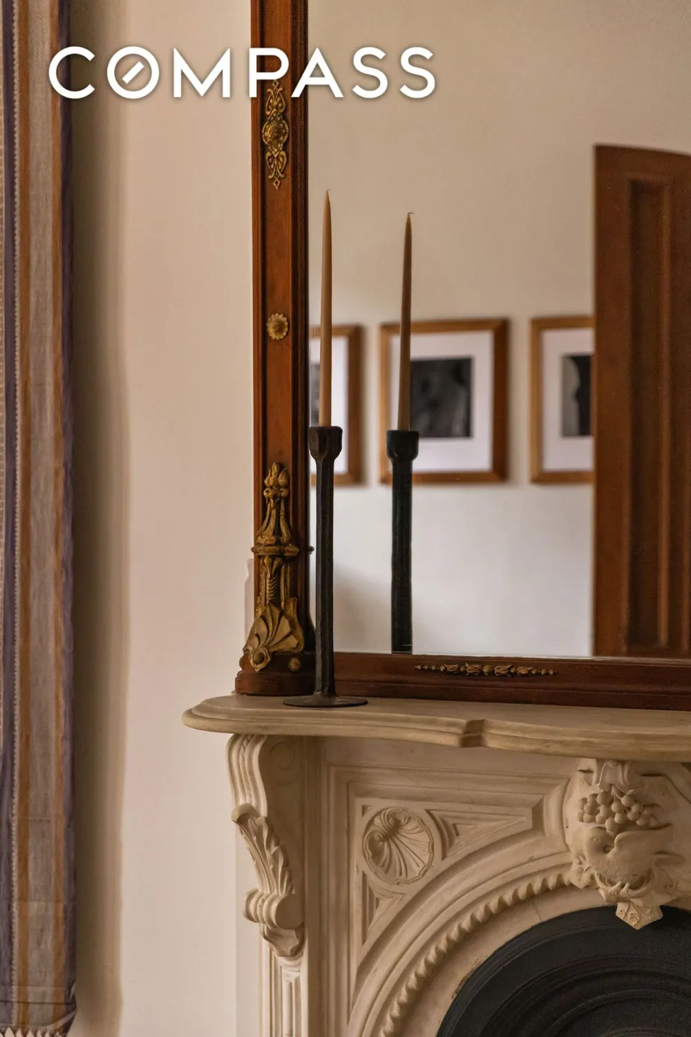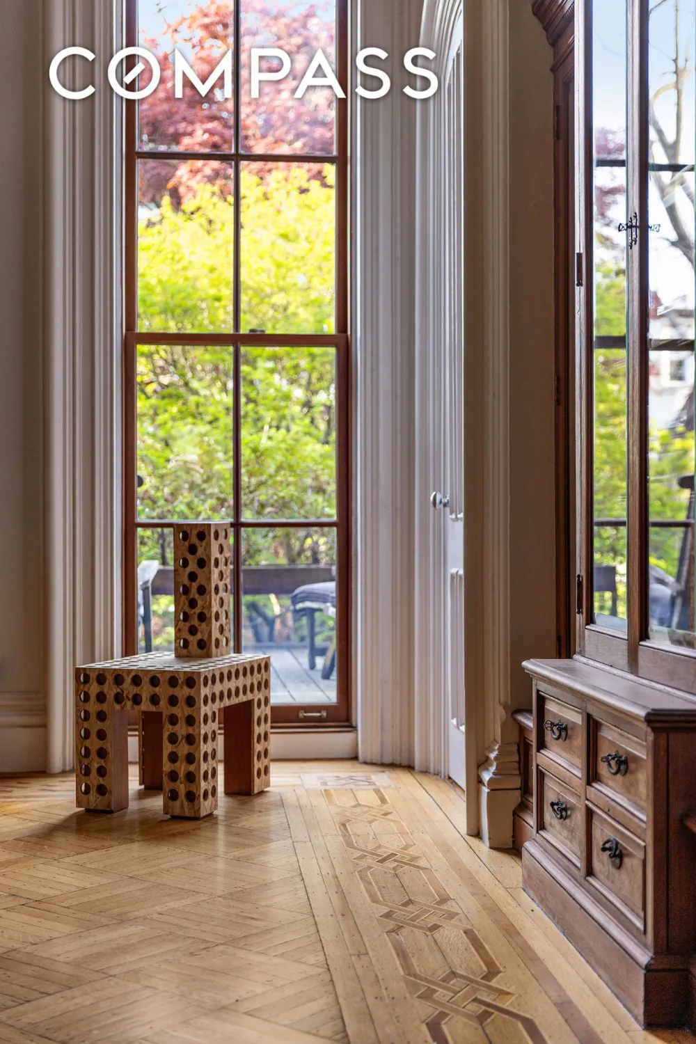 Original parquet floors, decorative marble fireplaces and mantelpieces, crown moldings and medallions, etched glass, walnut banisters, and pier mirrors now shine with exquisite care. The restored Italianate foundations are complemented by historically accurate customizations: 18 custom-built windows with mahogany frames, including double-height casements on the parlor level; foyer stone cut from the last slab of marble remaining from the lobby of the Empire State Building. Rewired chandeliers hang from over 12’ ceilings on the parlor floor, giving the home a quality of suspended light and space rare even amongst its fellow 20’ townhouses.