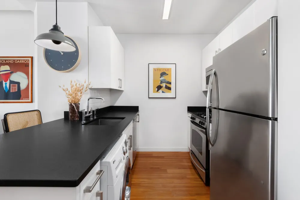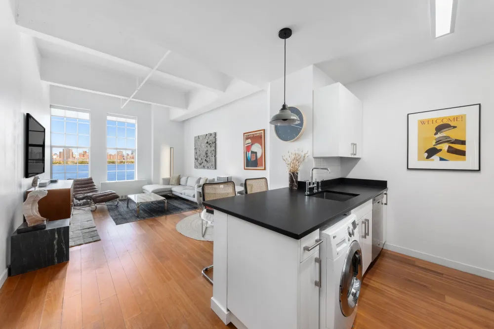 Step inside to discover soaring 11’8” beamed ceilings, oversized factory-style windows, and warm hardwood floors that create an expansive and airy ambiance. The open chef’s kitchen features an oversized breakfast bar, sleek black stone countertops, and a suite of stainless steel appliances, ideal for both entertaining and everyday cooking while enjoying sunset views over the river.