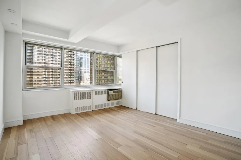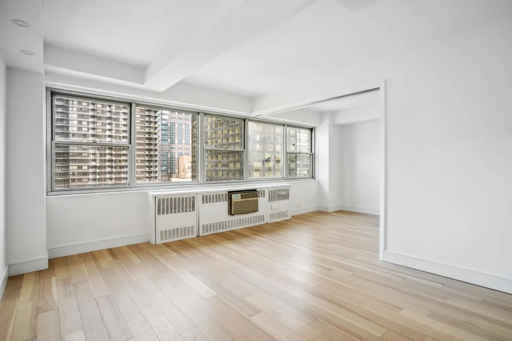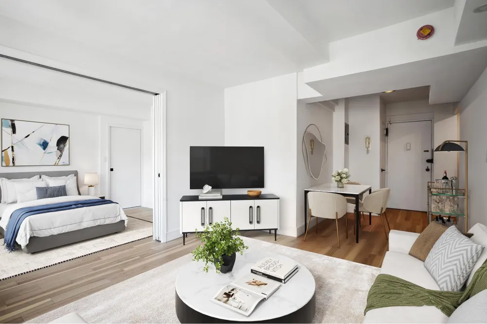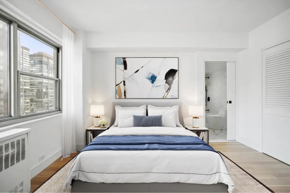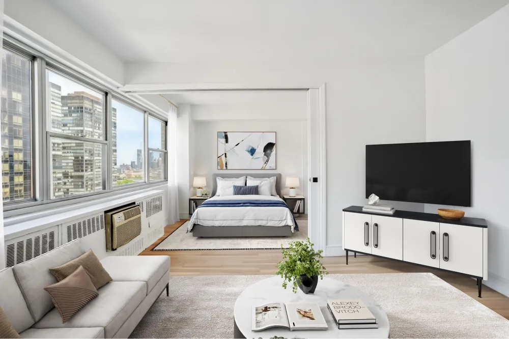 Welcome to Apartment 20D at 333 East 46th Street - a top-floor, sponsor-sale residence offering northern city and river views and a flexible, contemporary layout in the heart of Midtown East. This spacious home features a sleek and unique ensuite windowed bathroom, thoughtfully designed with modern finishes for a refined feel. A stylish 3-panel sliding door leads to the bedroom, allowing for either an open, loft-like ambiance or complete privacy when desired. The modern kitchen is tucked away from the main living area, maintaining a clean and seamless aesthetic, while the dedicated dining space offers convenience.