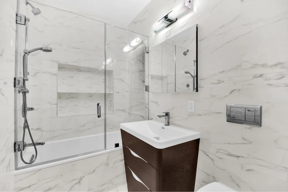 Carrara marble primary bathroom with tub, glass doors, wall mounted commode and floating vanity. Second bathroom has rain shower, brass fixtures, ceramic tiles with decorative bordering.