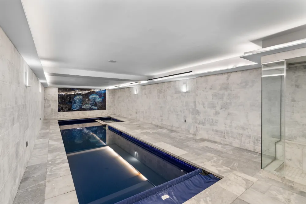 This sub-grade sanctuary features a 33-foot lap pool with a six-foot deep jacuzzi, a steam shower, and a private gym. Completing this level is a full bedroom and bathroom, ideal for guests or staff.