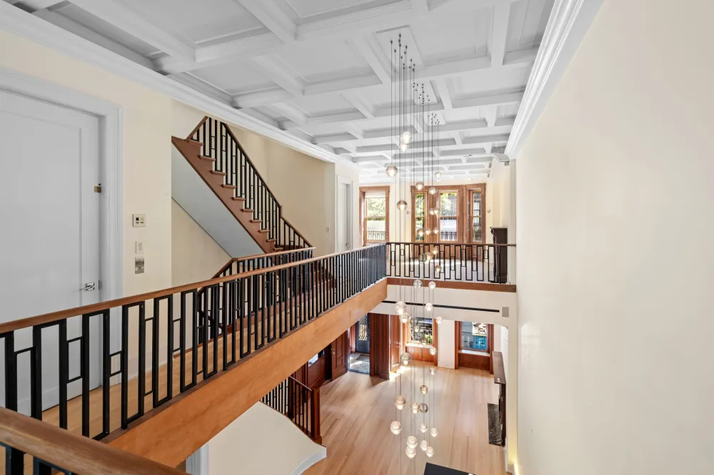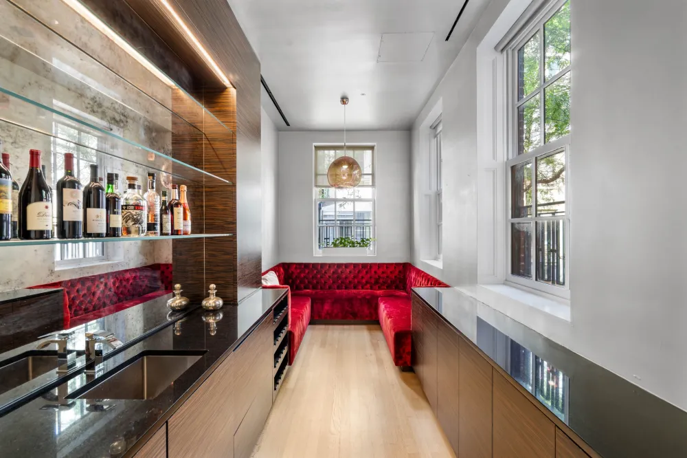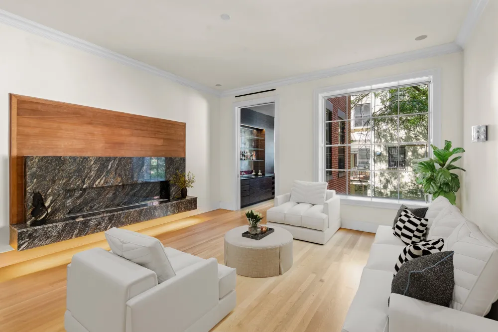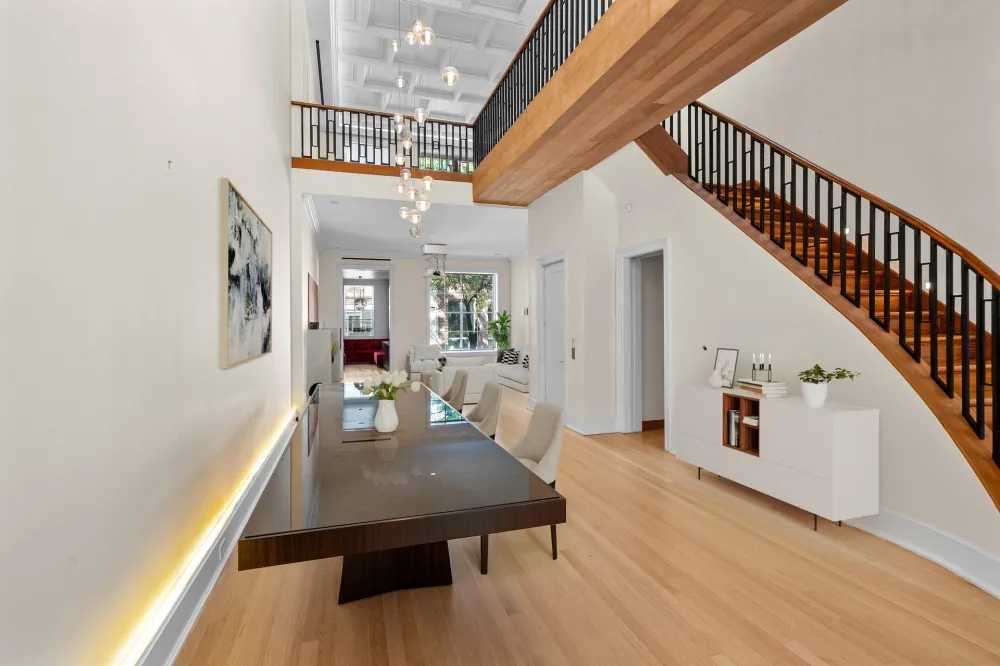 The parlor level is designed for stylish gatherings, featuring expansive living and dining areas, a cozy bar, and multiple fireplaces. The home’s deep extension provides additional space, enhancing the overall flow and functionality.