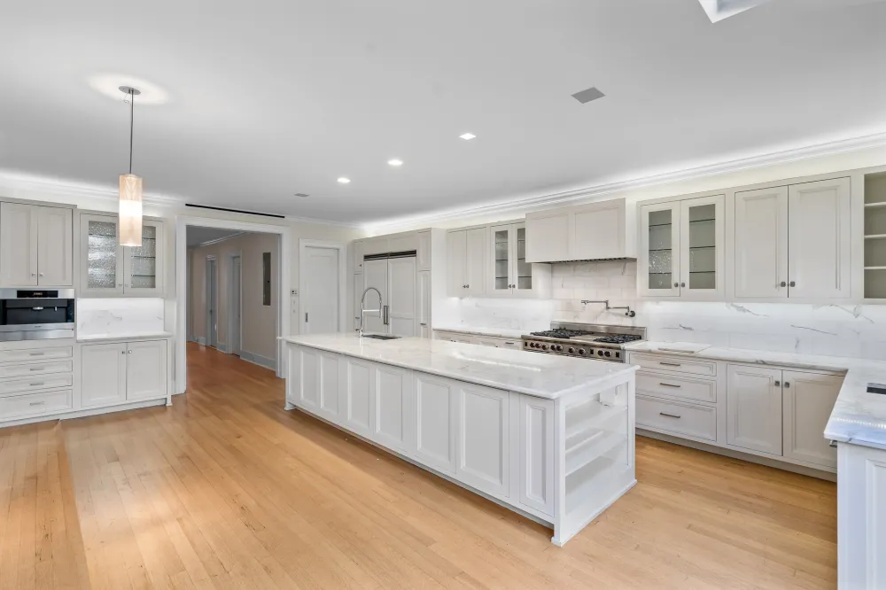 On the ground floor, a welcoming entry den and powder room lead to a stunning kitchen with Calacatta gold marble countertops, an eight-burner range, and abundant counter and pantry space. The kitchen extends to a private garden with an outdoor kitchen and custom planters.