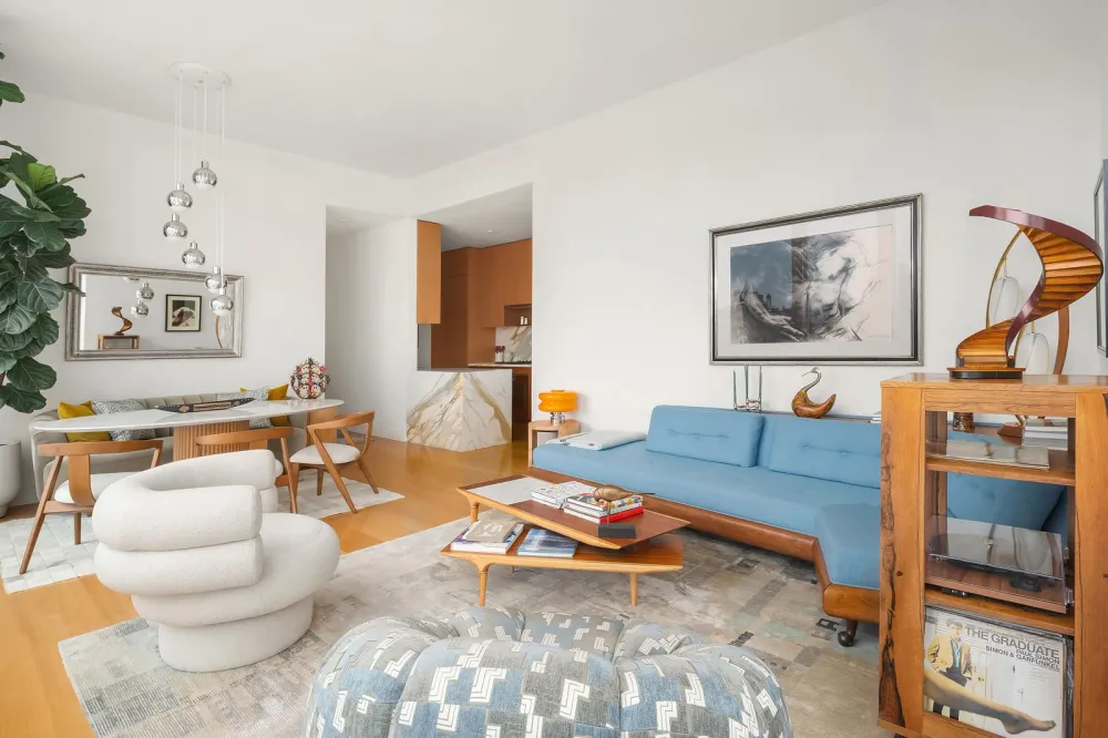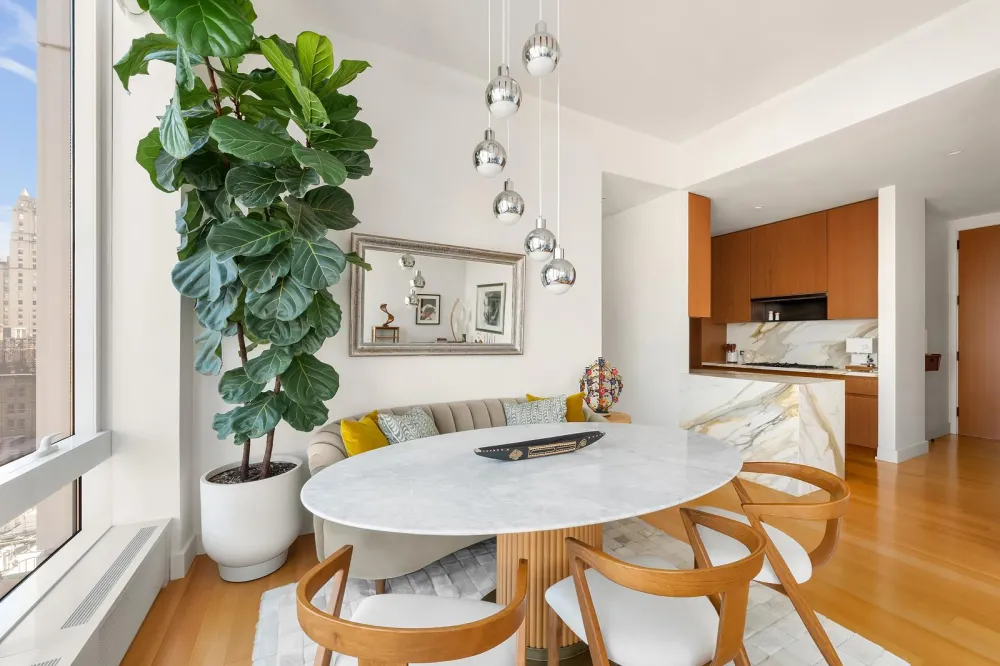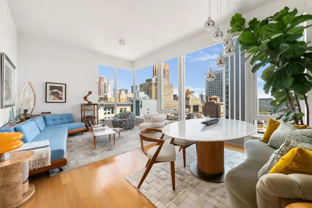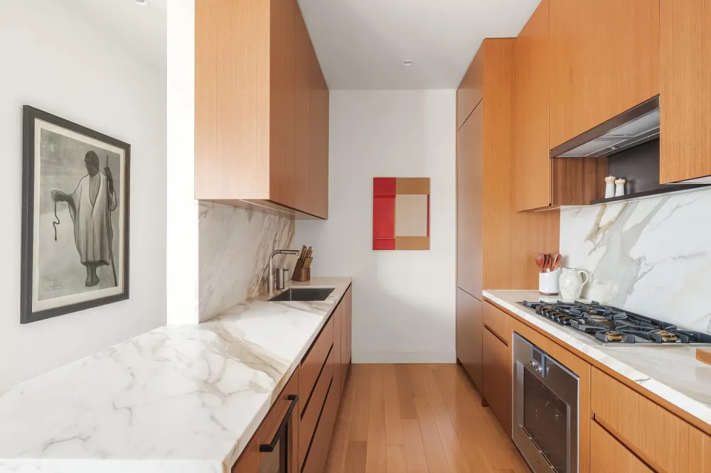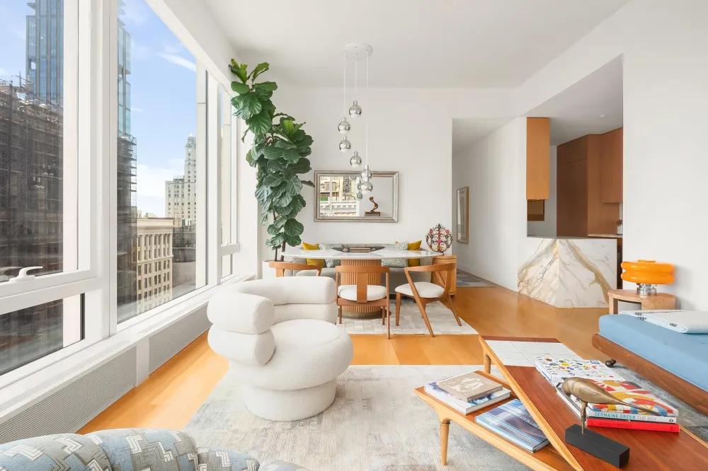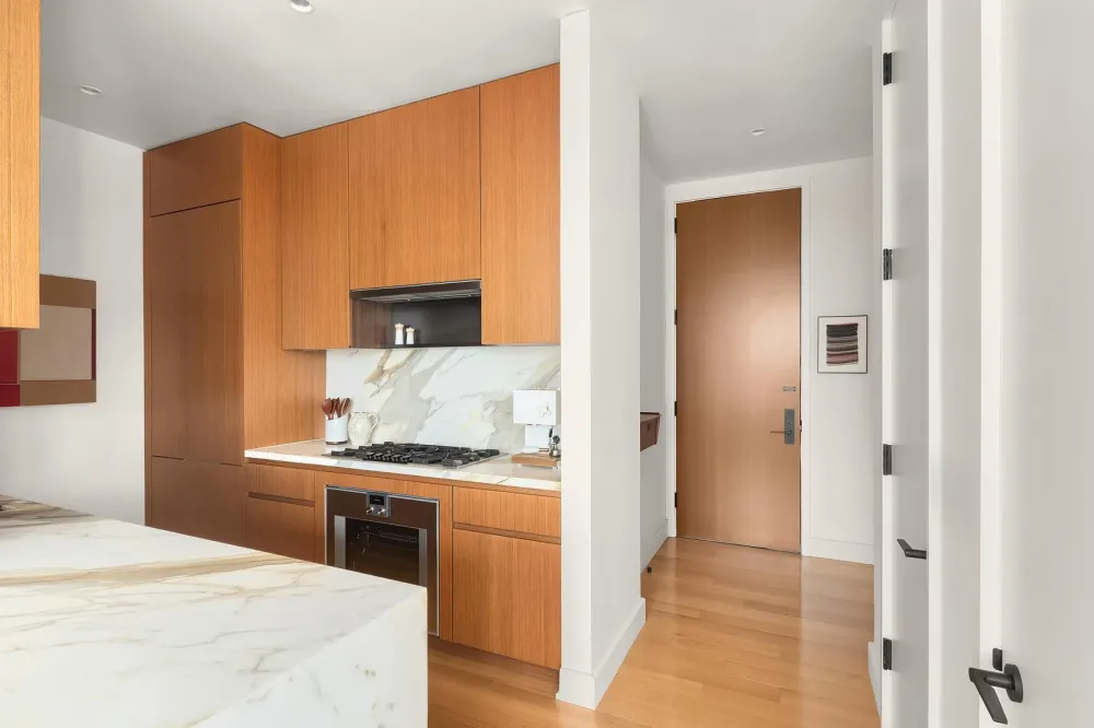 The corner living and dining room boasts 10-foot-tall windows, bathing the space in natural light. Adjacent is the open kitchen, which includes Gachot -designed custom rift-cut cabinetry, a Calacatta Borghini marble waterfall island and backsplash, and premium Gaggenau appliances: cooktop, combi-steam oven, convection double oven, refrigerator, and wine refrigerator.