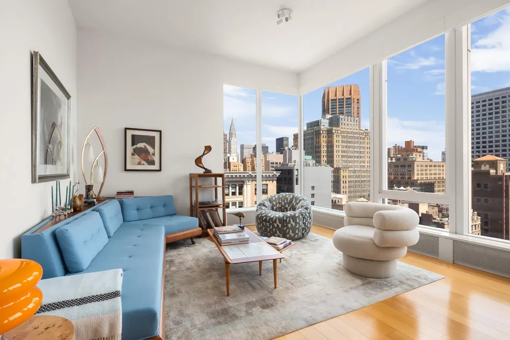 Welcome to Apartment 21C. This high-floor, 1,371-square-foot residence welcomes you with an entry foyer featuring a large coat closet. Immediately, you're met by the scale of the apartment-11-foot ceilings and sweeping views of Manhattan, including the iconic Chrysler Building.