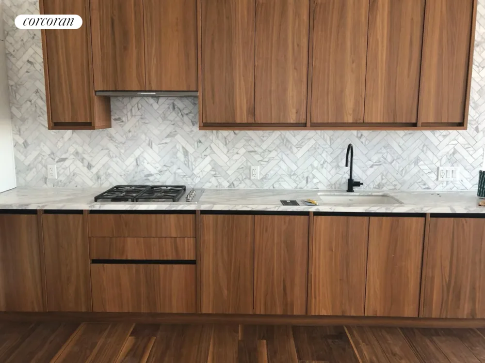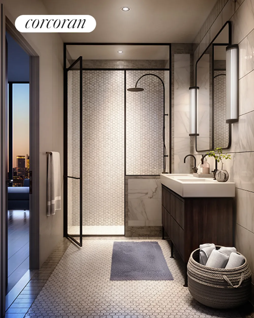 This residence features a ceiling height of 9-10 feet with floor to ceiling windows and a corner primary bedroom. The wide plank walnut floors highlight a palate of natural materials. The seamless kitchen is outfitted with a honed Statuario marble countertop and backsplash alongside with premium Miele appliances, including a gas cook-top and double wall ovens. The apartment includes a Bosch washer and dryer and high-quality window treatments. There are two marble bathrooms, one with a stall shower outfitted with walnut vanities and matte black metal and polished chrome fixtures.