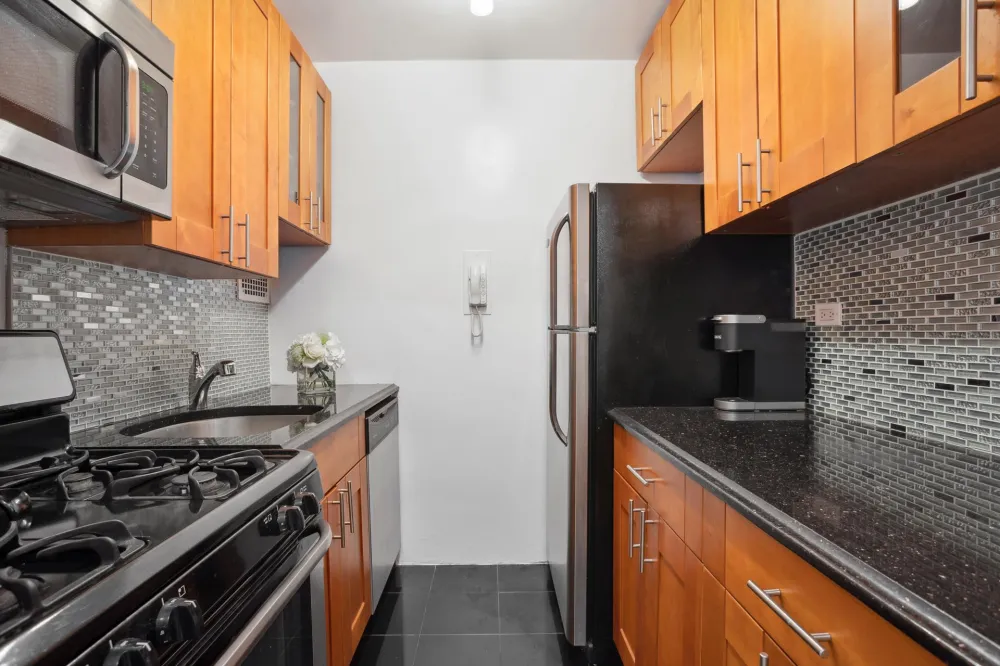The kitchen features stainless steel appliances, including a gas range, along with abundant counter space and cabinetry for all your culinary needs. A vestibule-outfitted with additional storage-leads to the sun-filled bedroom and adjacent full bathroom.