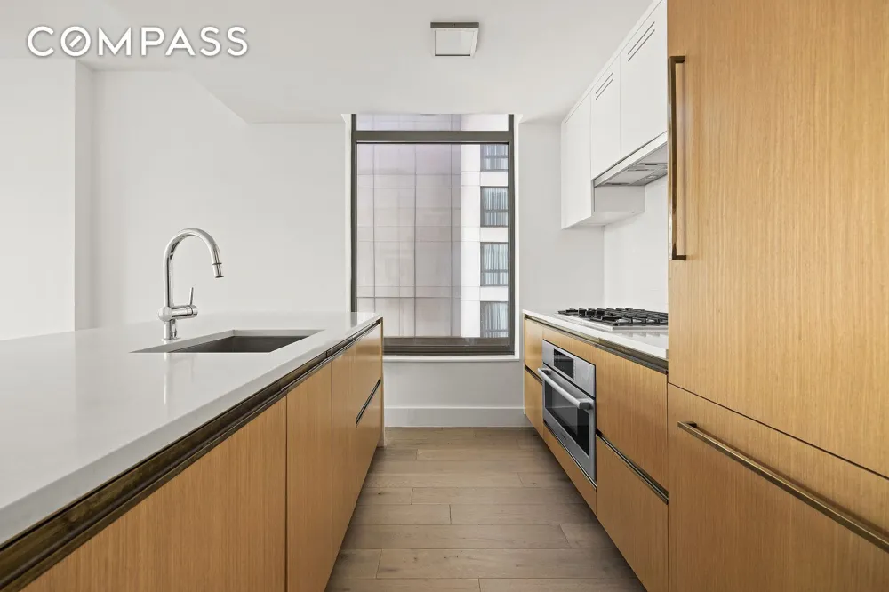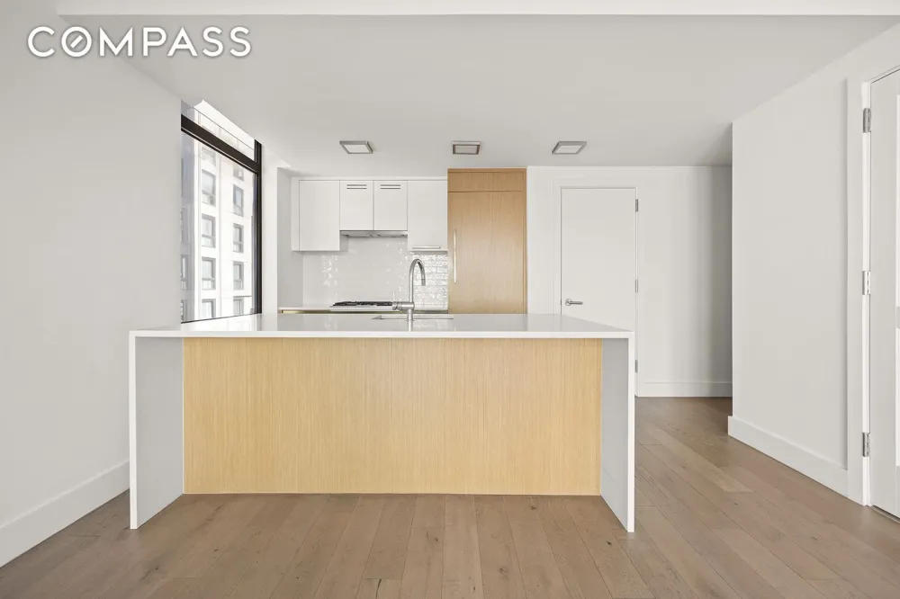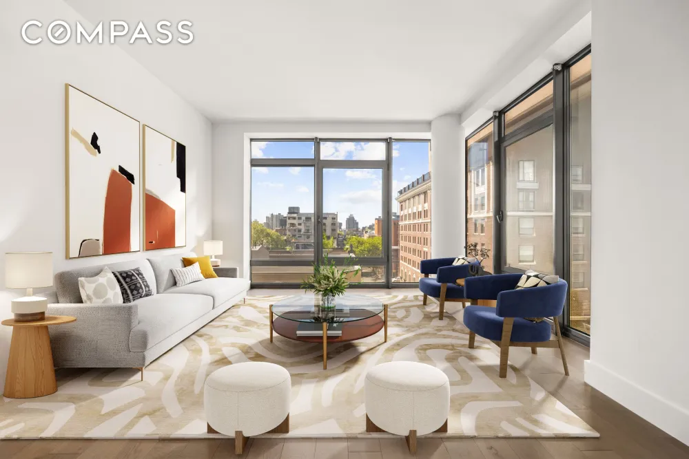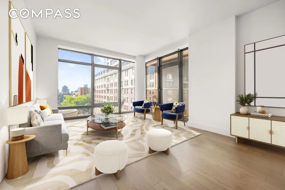 A few details make 6B one of the most desirable lines in the building. For starters, a lovely entryway creates a moment to relax before entering the apartment. Take off your coat, take off your shoes and unwind before entering into your quiet oasis in the sky. As you continue on, you will immediately be ‘wowed’ by this corner, sun-filled living room. Flooded with southern light, this quiet and serene apartment is high above it all with floor-to-ceiling windows, gorgeous 6 inch white oak wood floors, integrated central air conditioning, fully outfitted closets and custom motorized shades in every room.