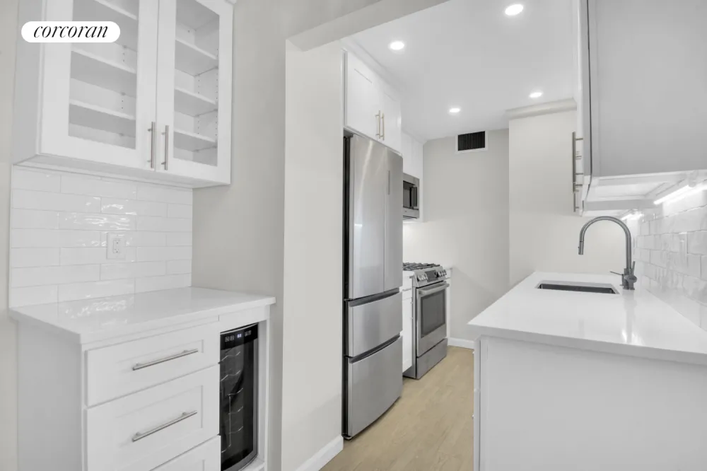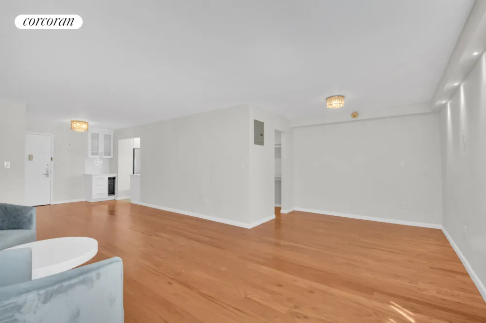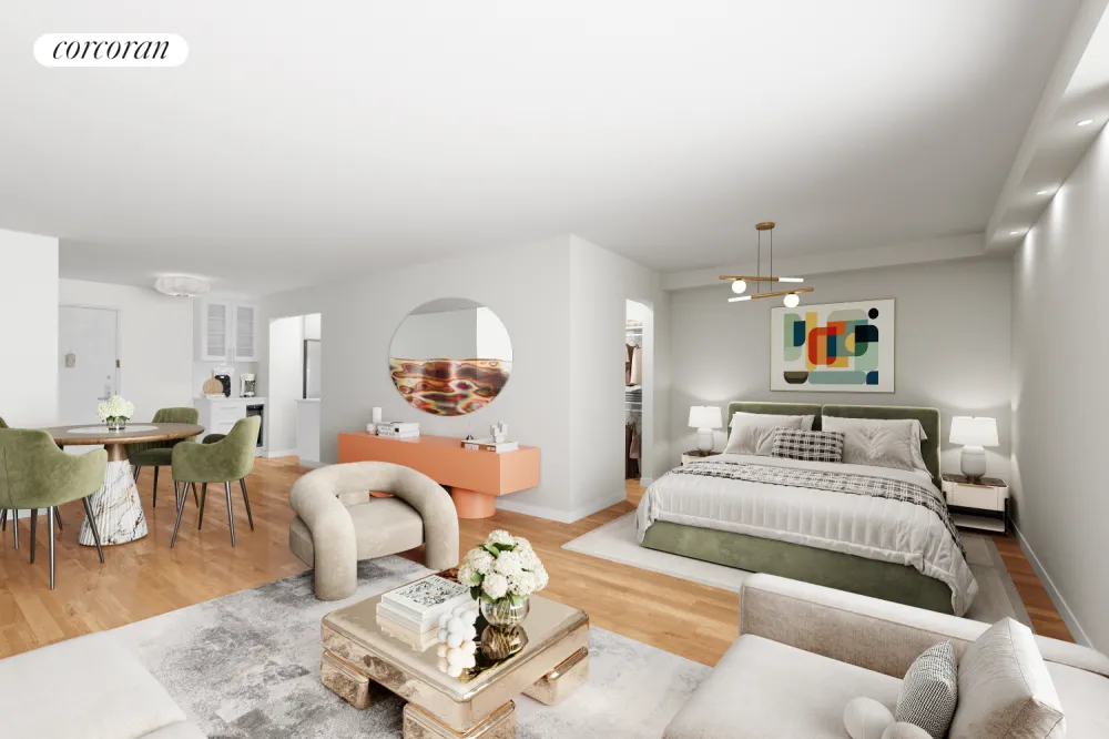 A spacious foyer opens into a generous living and dining area, seamlessly connected to a sleeping alcove. Just off the living space, a renovated kitchen is outfitted with stainless steel Bosch appliances, ample cabinetry, and a built-in wine refrigerator-ideal for entertaining or everyday comfort. The renovated bathroom with a large soaking tub is accessed through a dressing area with dual closets, enhancing both functionality and privacy.