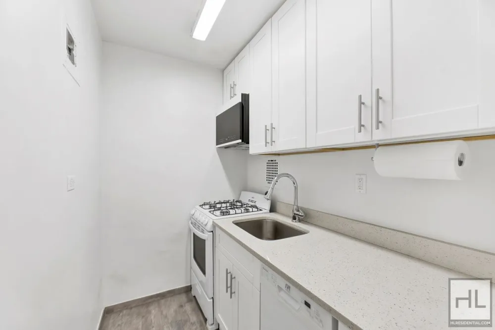 The galley kitchen, set just off the entry, includes a gas stove, microwave, dishwasher, and cabinetry throughout, providing convenient storage and space for meal prep and daily cooking. Whether you're grabbing a quick breakfast before a busy day or preparing dinner for friends and family, this kitchen blends function and style to support your culinary needs.