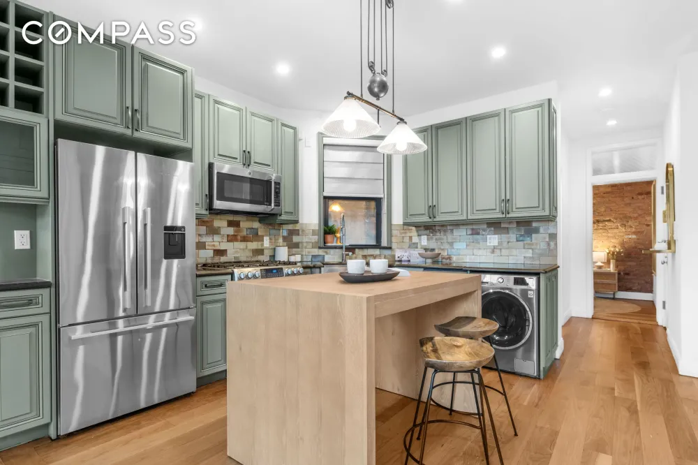 The spacious living and dining area features nearly 9-foot ceilings, hardwood floors, and oversized windows that flood the space with natural sunlight. The thoughtfully renovated kitchen offers sage green cabinetry, a stylish tile backsplash, stainless steel appliances, and ample counter space for meal prep and casual dining. A discreetly installed washer/dryer combo provides the convenience of in-home laundry.