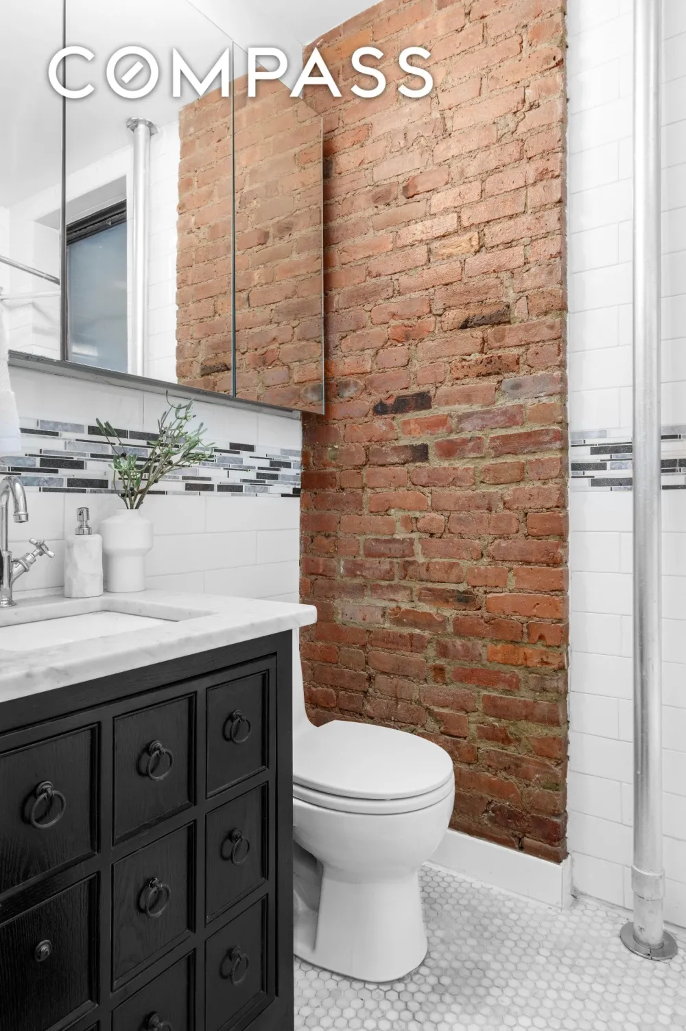 The peaceful bedroom includes exposed brick accents and comfortably fits a queen-size bed, with space for nightstands and additional storage. The windowed bathroom features penny tile floors, a marble vanity, and more brick detail for added warmth and character.