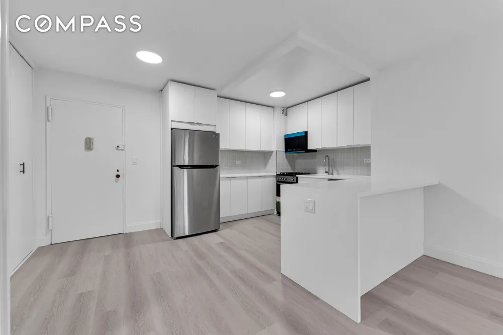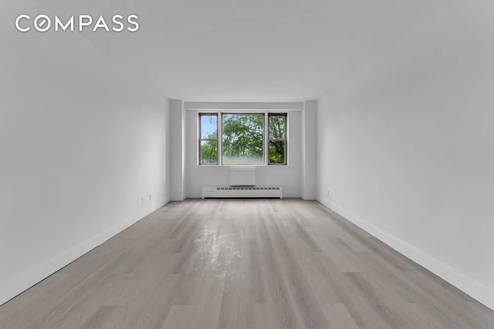 Sophisticated Interior: This fully renovated studio is bathed in natural light from oversized windows with treetop views, complemented by brand-new wide-plank flooring and gallery-white walls, providing a fresh and elegant canvas for any décor.