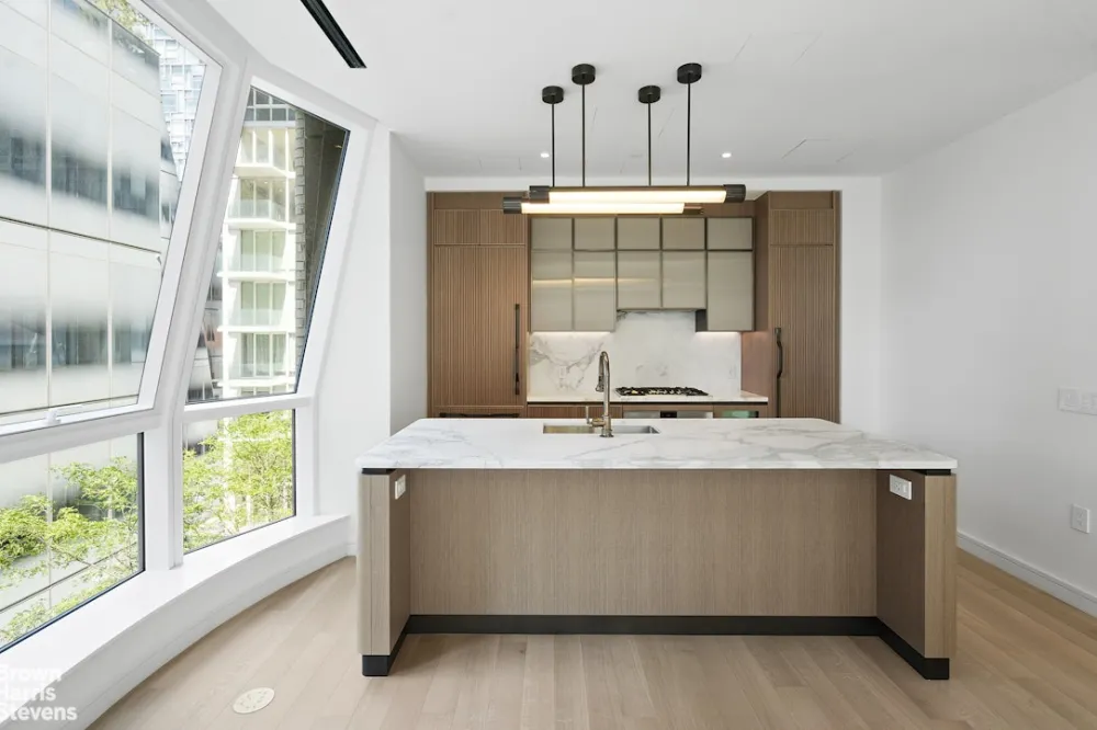 The open, windowed chef's kitchen features a full suite of Gaggenau appliances including a wine refrigerator. The kitchen is further outfitted with convex fluted oak cabinetry, Calacatta Venato marble slab countertops and backsplash, and custom bronze-finished trim and hardware.