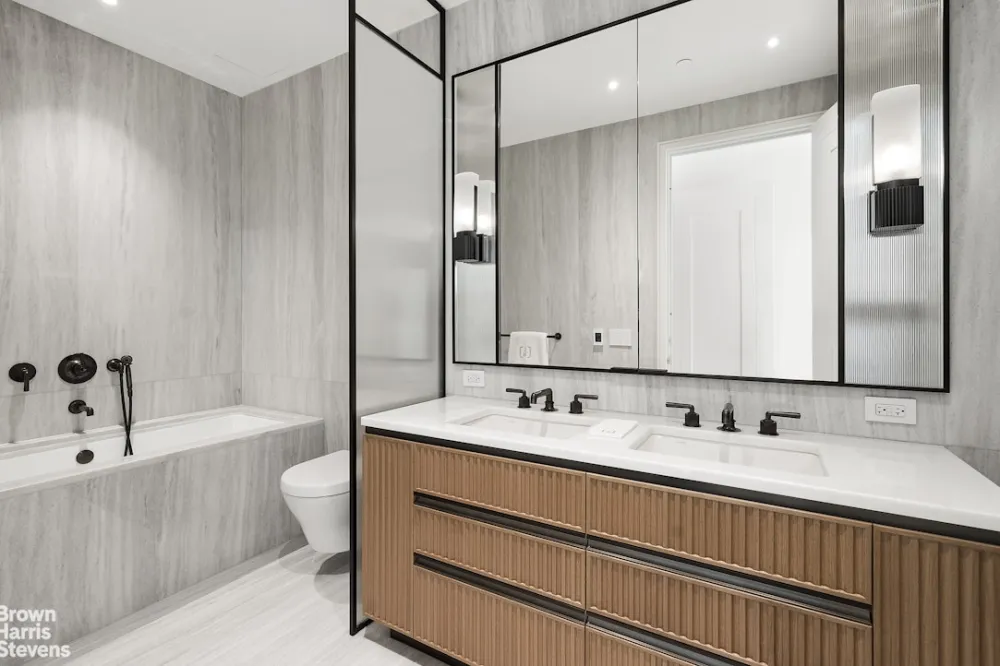 The king-size, south-facing primary suite features a large, custom built-out walk-in closet and designer bathroom. The primary bathroom is finished in Nestos Beige marble slab flooring and walls, polished Emperador Grey marble countertops, specialty glass wall sconces and fluted mirror panels, custom double vanity, wall-mounted Toto toilet, and radiant heated floors. There is a large deep-soaking tub and a separate stall shower.
