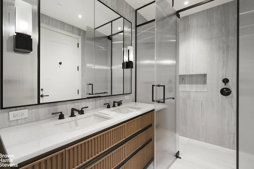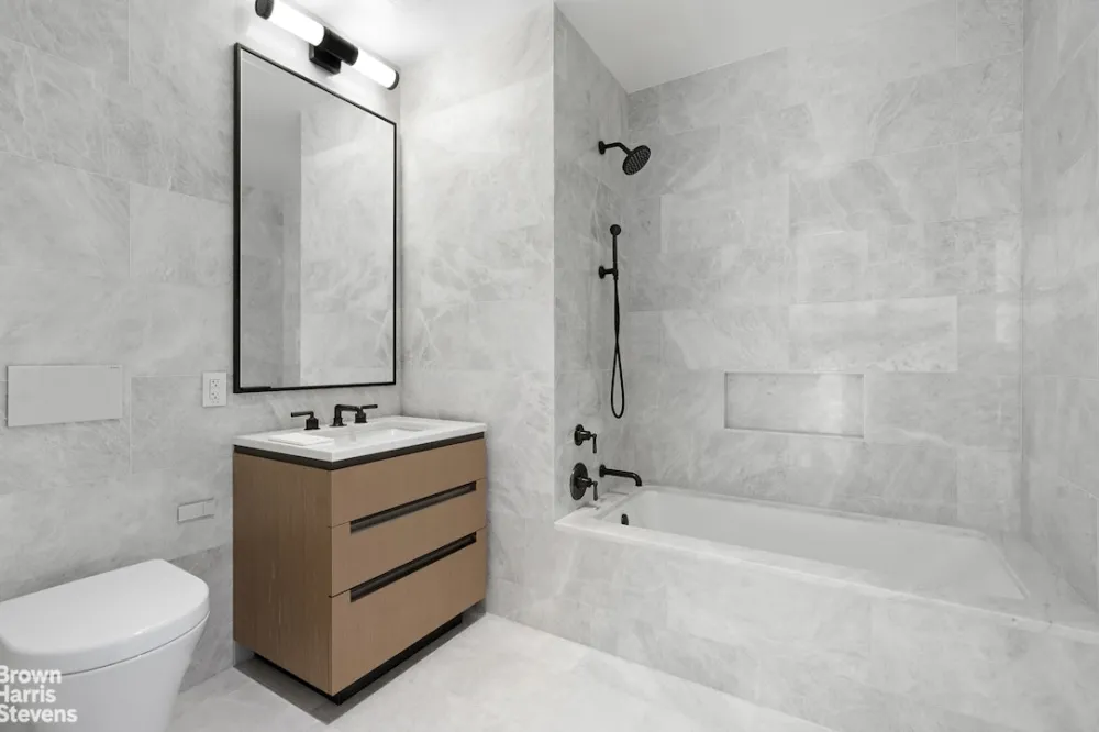 The spacious second bedroom boasts a massive south-facing window and a large linear closet. The impeccably-finished second bath features Cristallo honed marble flooring and polished marble wet walls. The second bathroom is further outfitted with a custom vanity, oak cabinetry, and Cristallo Pearl counter.