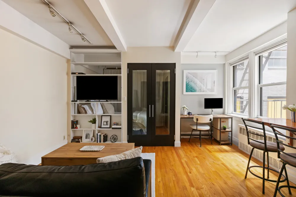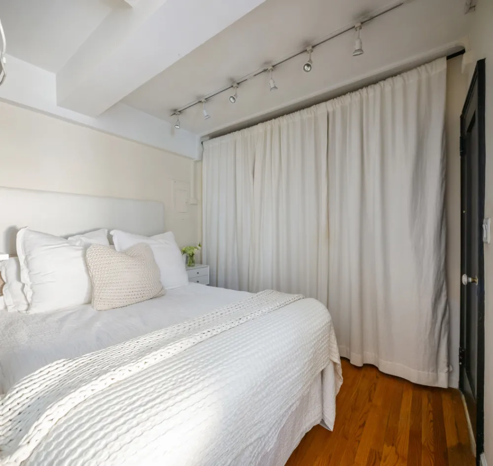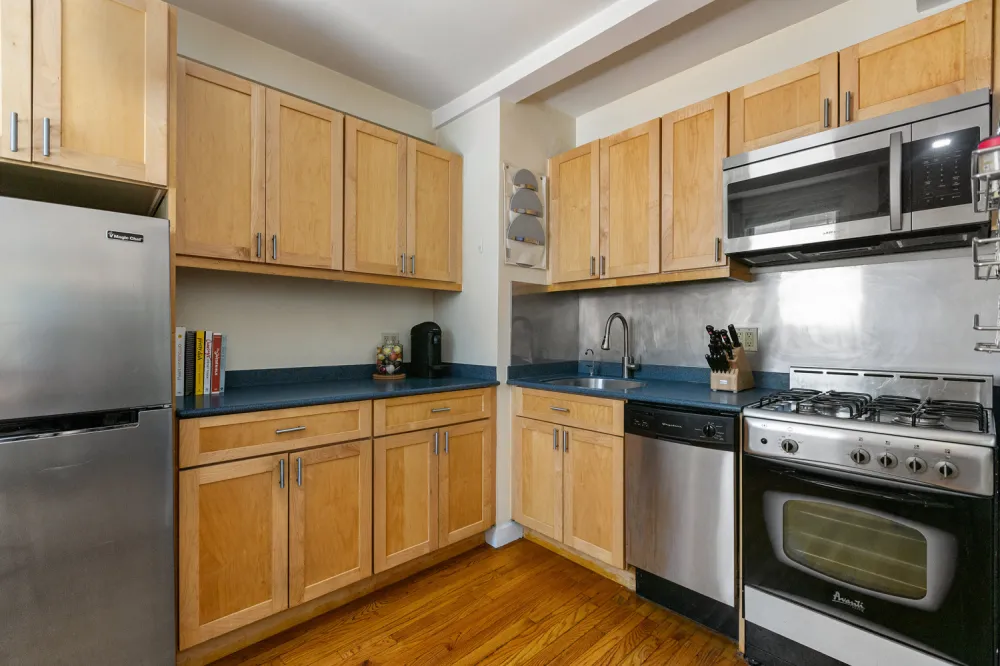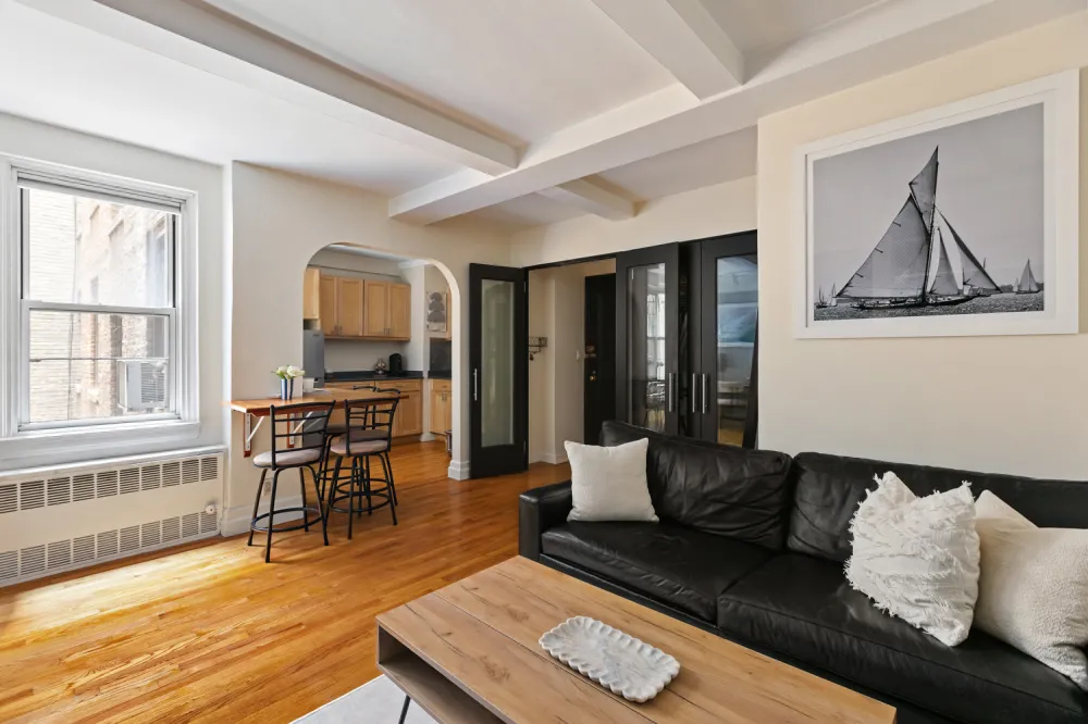 The home has been thoughtfully redesigned to maximize both space and functionality. The standout feature is the oversized kitchen , complete with generous counter space, sleek cabinetry, and high-end appliances. A separate sleeping alcove creates a sense of distinction between living and resting areas, enhancing the home's livability. The windowed bathroom brings in natural light and has been fully updated with modern finishes. Additional features include multiple large closets for excellent storage, refinished hardwood floors , and whisper-quiet interiors thanks to the building's solid construction.