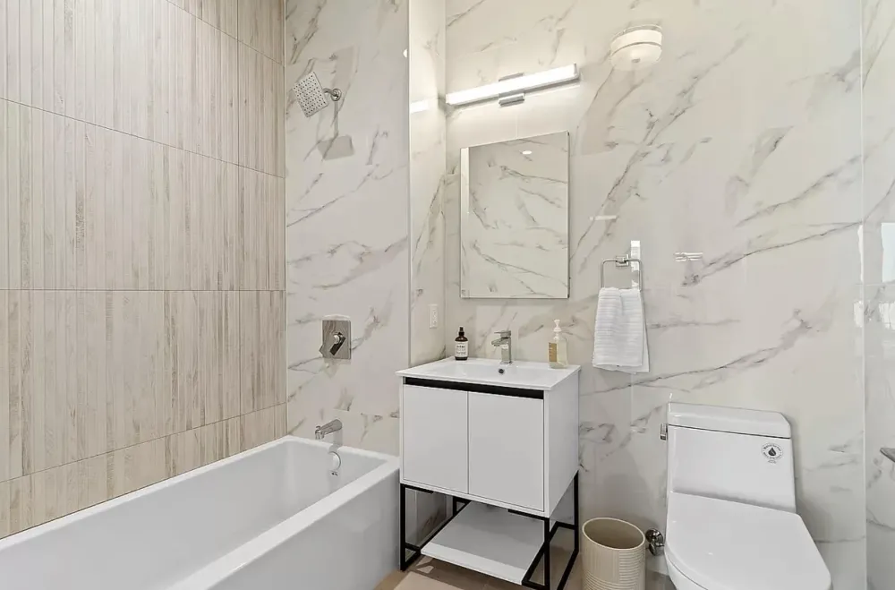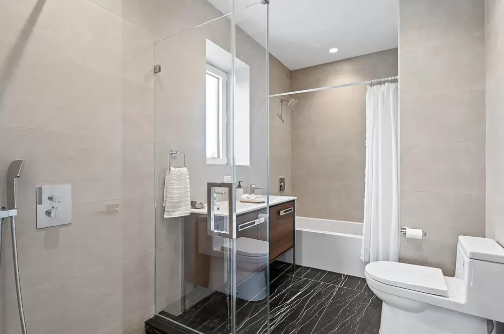 The primary bedroom has access to both terraces and includes couples’ walk-in closets and a skylit en-suite bathroom with a windowed double vanity, large format porcelain tiled walls and floors, a glass-enclosed rainfall shower, and a Maxx Rubix soaking tub.