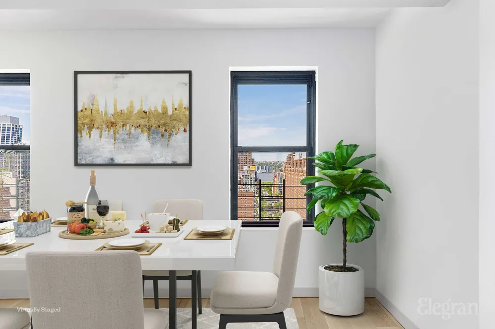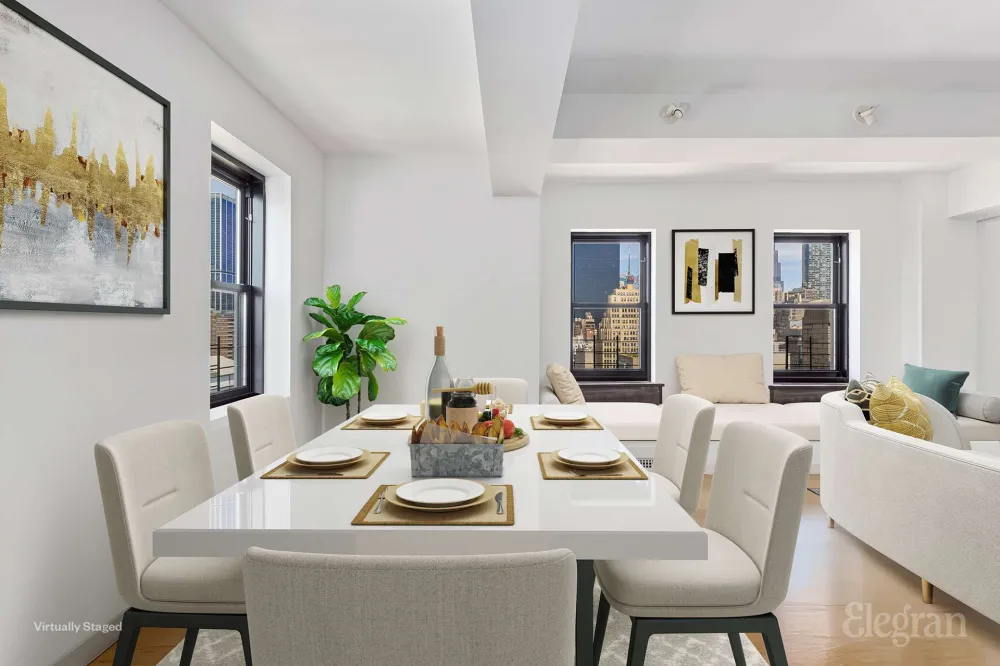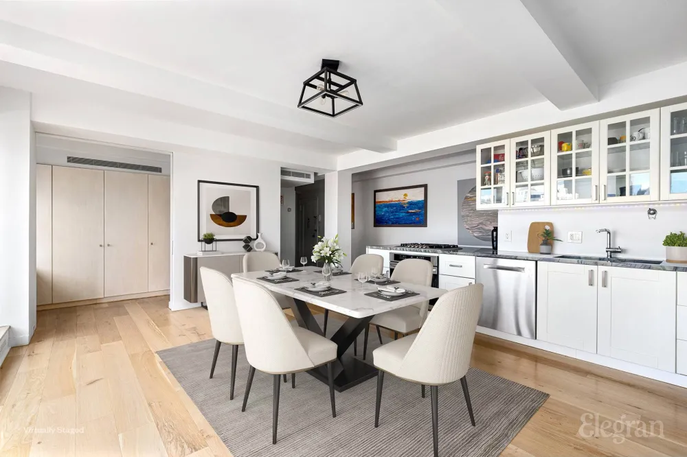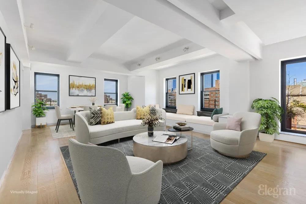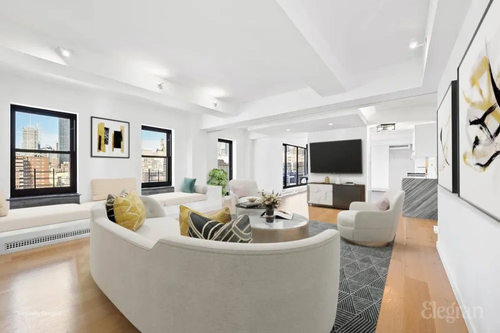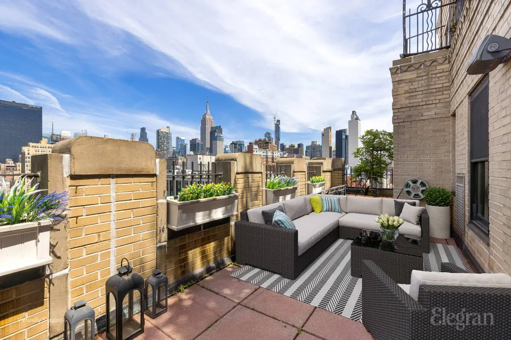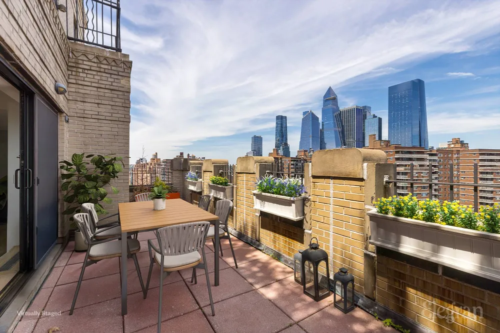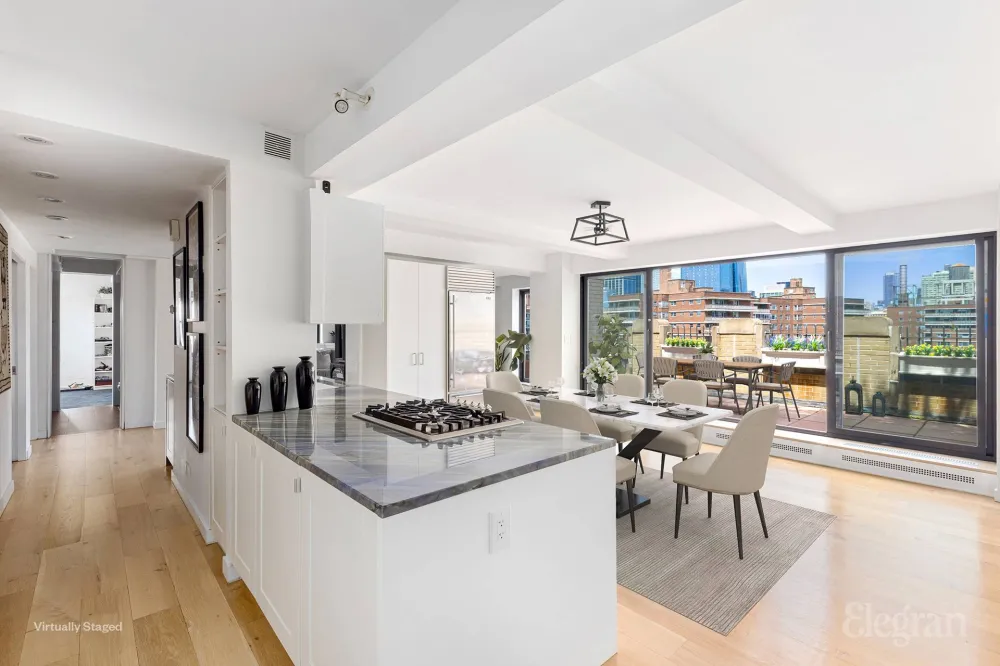 Bathed in natural light from four exposures, the residence opens into a gracious entryway with a windowed powder room, perfect for welcoming guests. The heart of the home is a sun-drenched, open living and dining area that flows effortlessly into a custom chef’s kitchen—ideal for both everyday living and entertaining. Step out onto your expansive planted terrace, a rare urban sanctuary, and take in sweeping views of the Hudson River, the Empire State Building, and the city skyline.