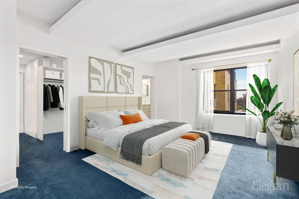 A serene hallway leads to the private wing, where three tranquil bedrooms offer comfort and flexibility. The oversized primary suite features a spacious walk-in closet and a windowed en suite bath. The second and third bedrooms both enjoy bright south and west exposures with partial views of the Hudson River—ideal as peaceful sleeping quarters, stylish guest rooms, or flexible spaces to suit your needs.