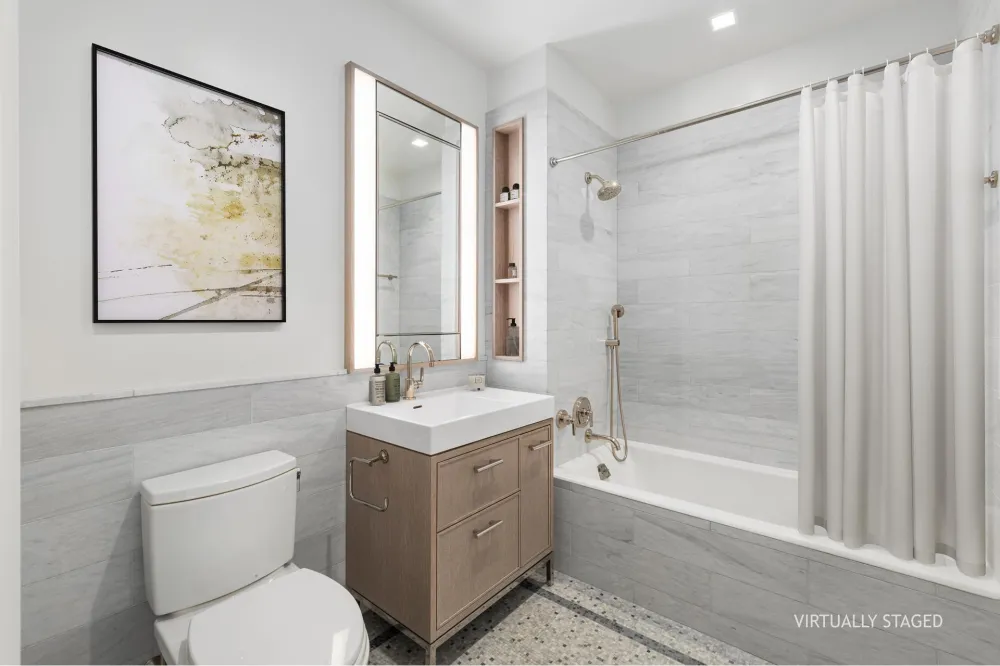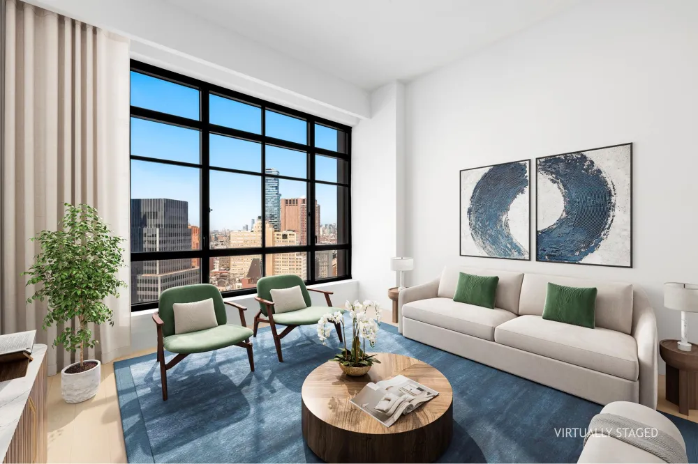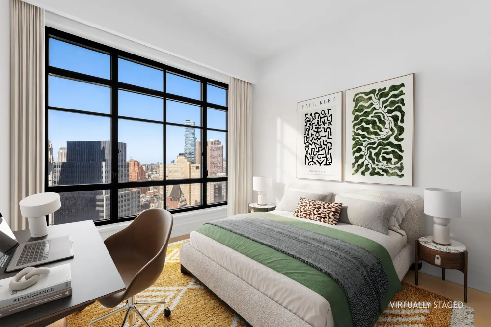 Perched on a high floor and offering magnificent park-facing views over historic City Hall Park, this meticulously designed 1,117 SF two-bedroom, two-bath home features wide plank Italian oak flooring, oversized casement windows, and refined 9" decorative moldings.