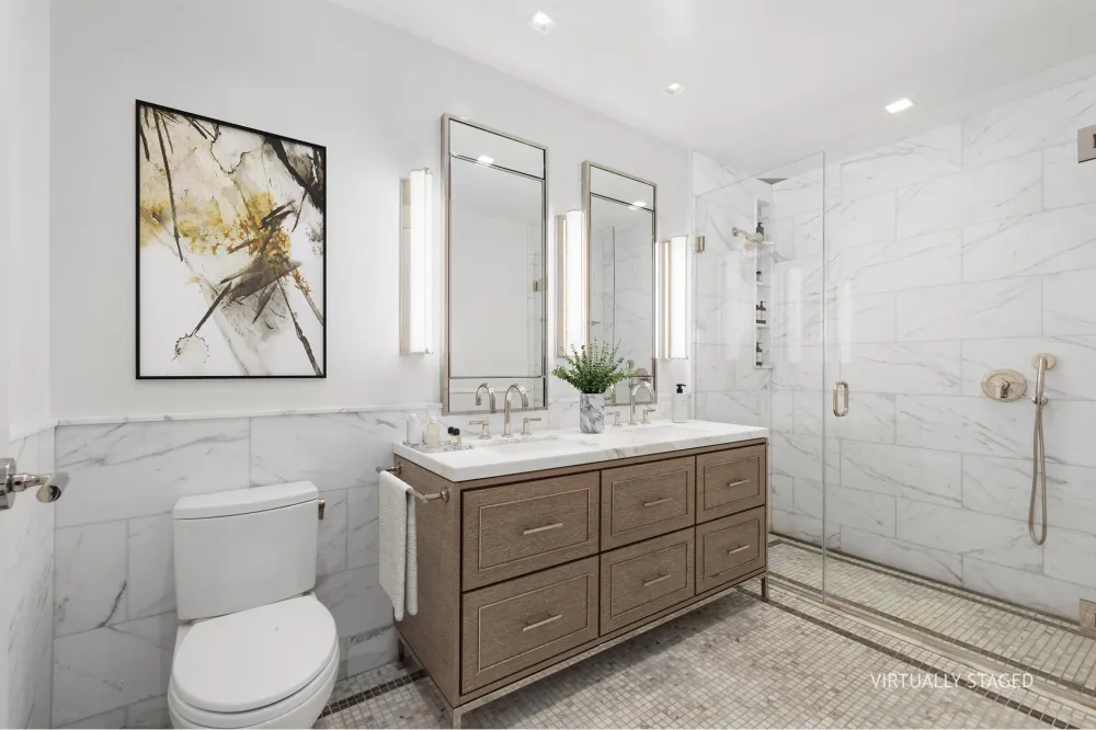The serene primary suite features a generous walk-in closet and a spa-like en-suite bath adorned with Calacatta Gold marble vanity top and wainscoting. A custom European white oak vanity, Kallista polished nickel fixtures, and radiant heated floors provide an added touch of luxury.